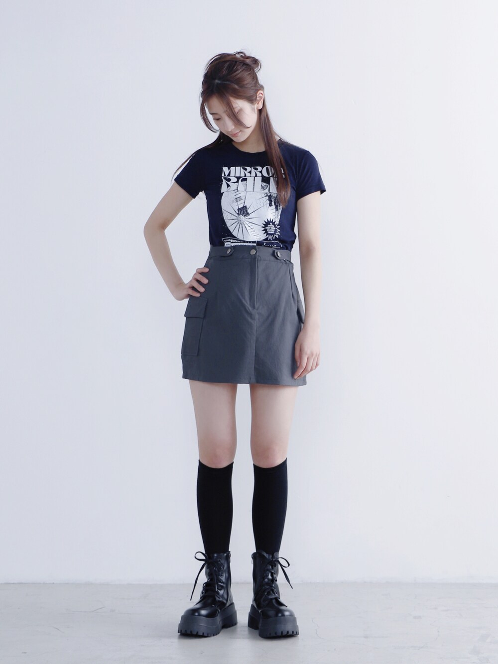 MIRROR BALLピチT color: navy, white size: free カーゴミニスカート color: gray, black size: free コンバットブーツ color: black size: small(23.5), medium(24.5)