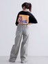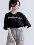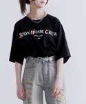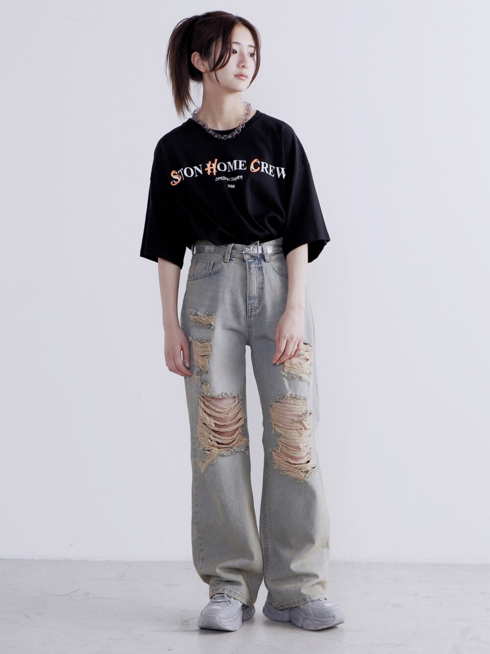 バックパッチビッグTシャツ color: black, white size: free ダメージデニムパンツ color: light indigo blue size: small, medium ボリュームソールスニーカー color: gray, black, white size: small(23.5), medium(24.5) クリアチェーンネックレス color: black, clear size: free