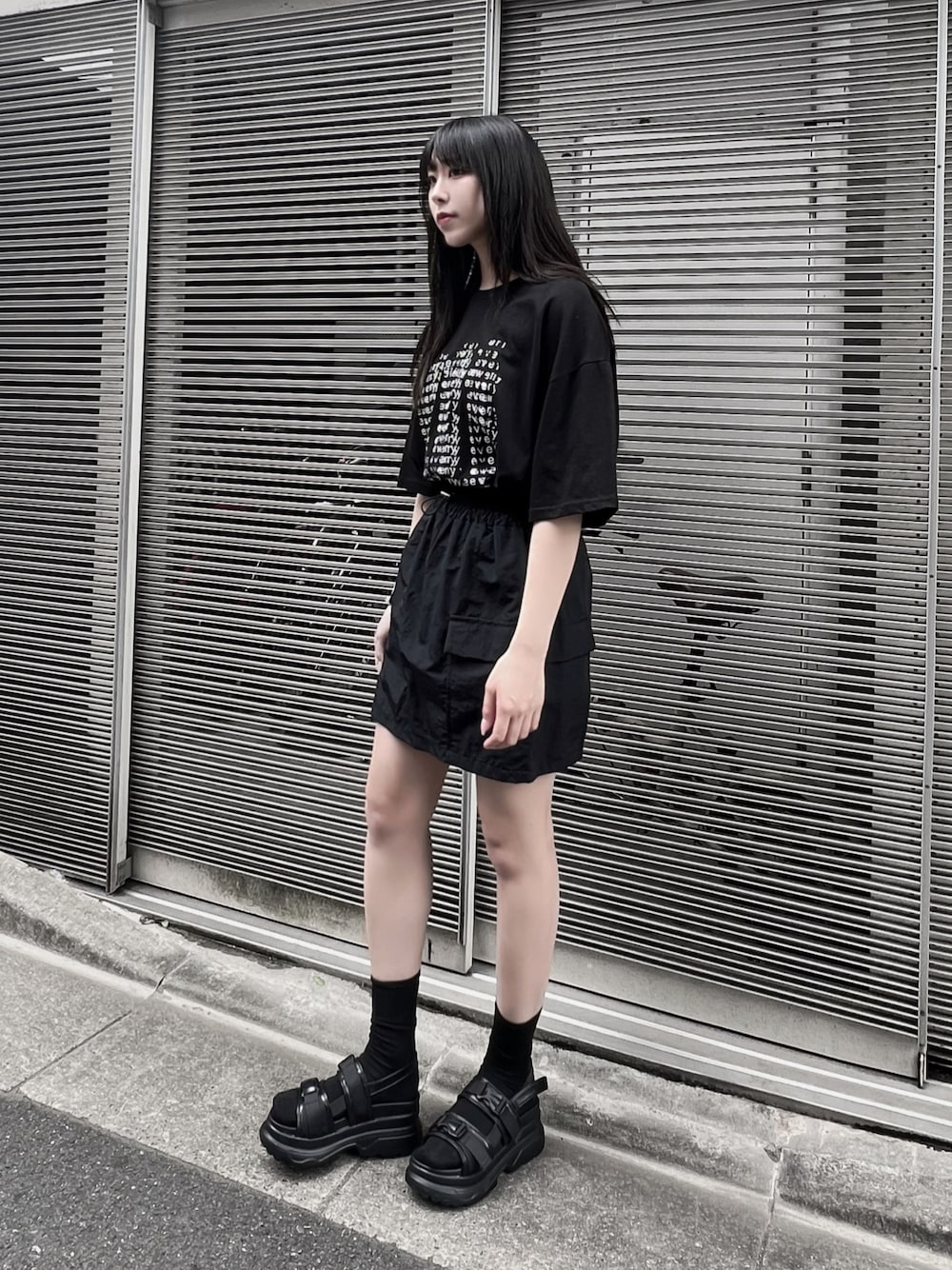 every Tシャツ color: black, white size: free ナイロンカーゴミニスカート color: black, white, light purple size: free ボリュームソールスサンダル color: black, white size: small(23.5), medium(24.5)