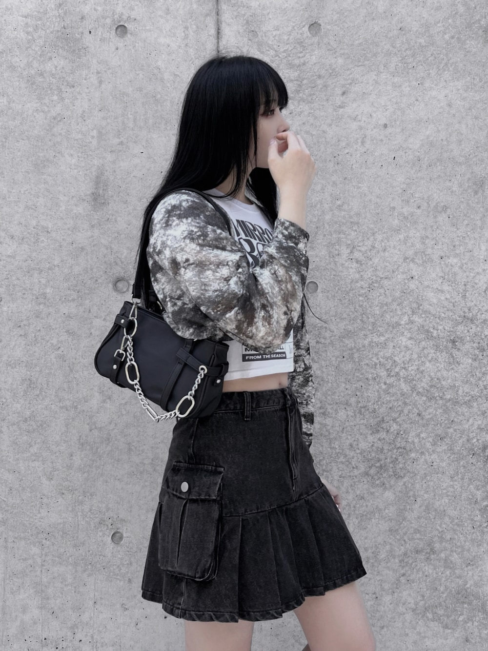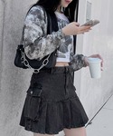 タイダイ柄サマーボレロカーデ color: black size: free MIRROR BALLピチT color: white, navy size: free カーゴプリーツヘムデニムスカート color: black, indigo blue size: small, medium チェーンショルダーバッグ color: black size: free