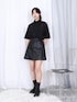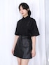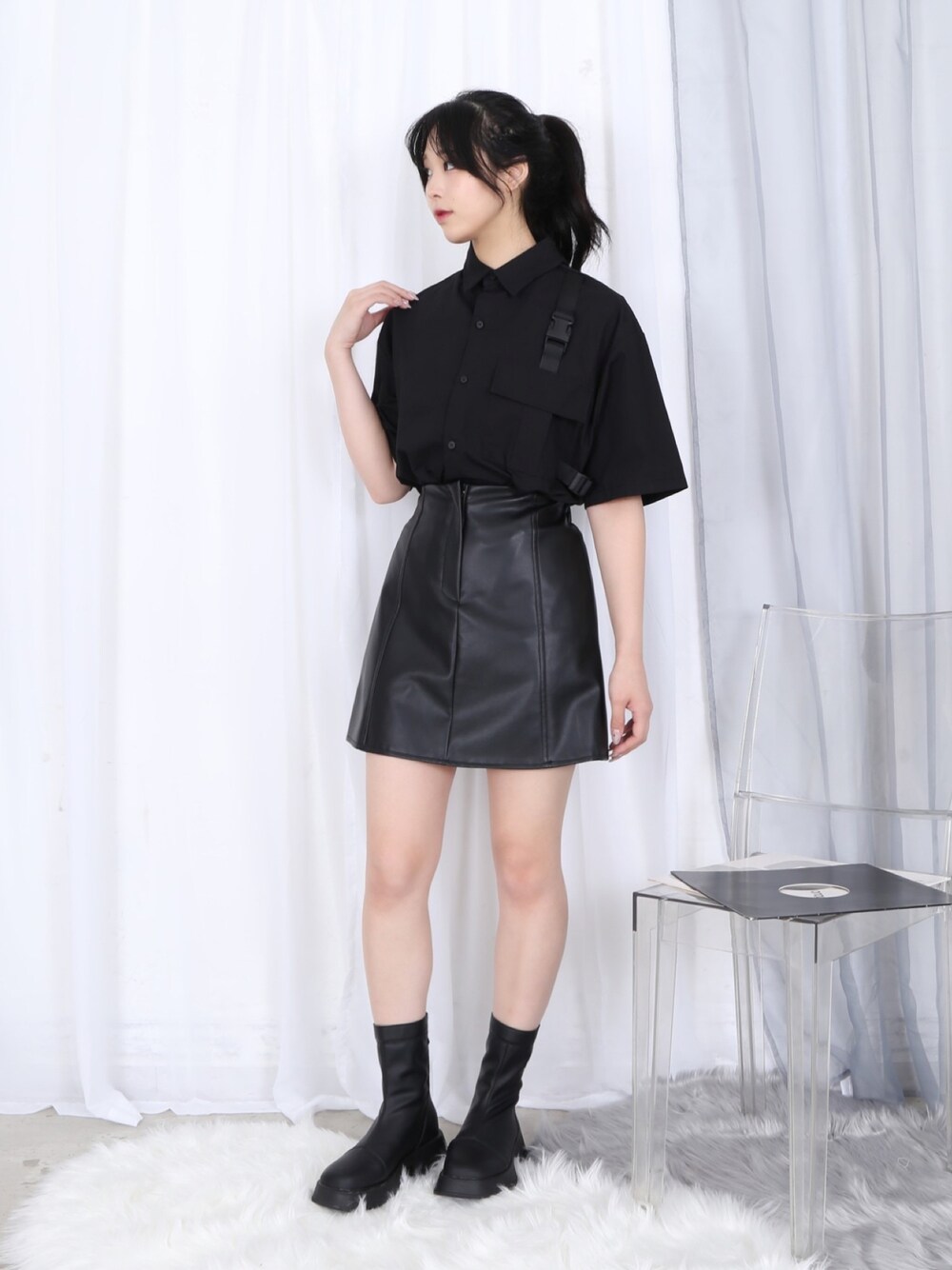 ベルテッドシャツ color: black, charcoal size: small, medium フェイクレザー台形ミニスカート color: black size: free フィットブーツ color: black size: small (23.5), medium(24.5)