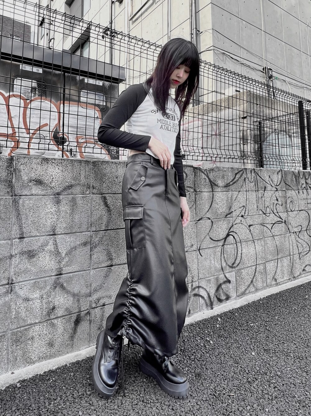 カレッジロゴラグラントップス color: black size: free フェイクレザーライダーススカート color: black, charcoal size: free コンバットブーツ color: black size : small(23.5), medium(24.5)