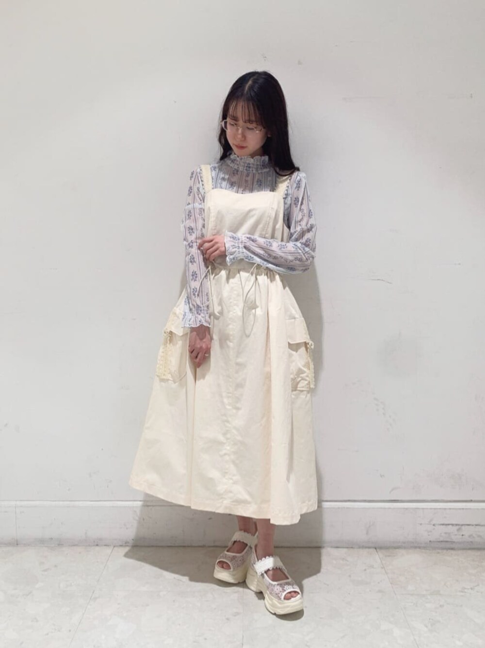 淡いカラーでまとめた春色コーデ♡ お花柄のトップスが春にぴったりです♪ ジャンスカはウエストを絞れるデザインなので、お好みのシルエットで着用いただけますよ(^O^)