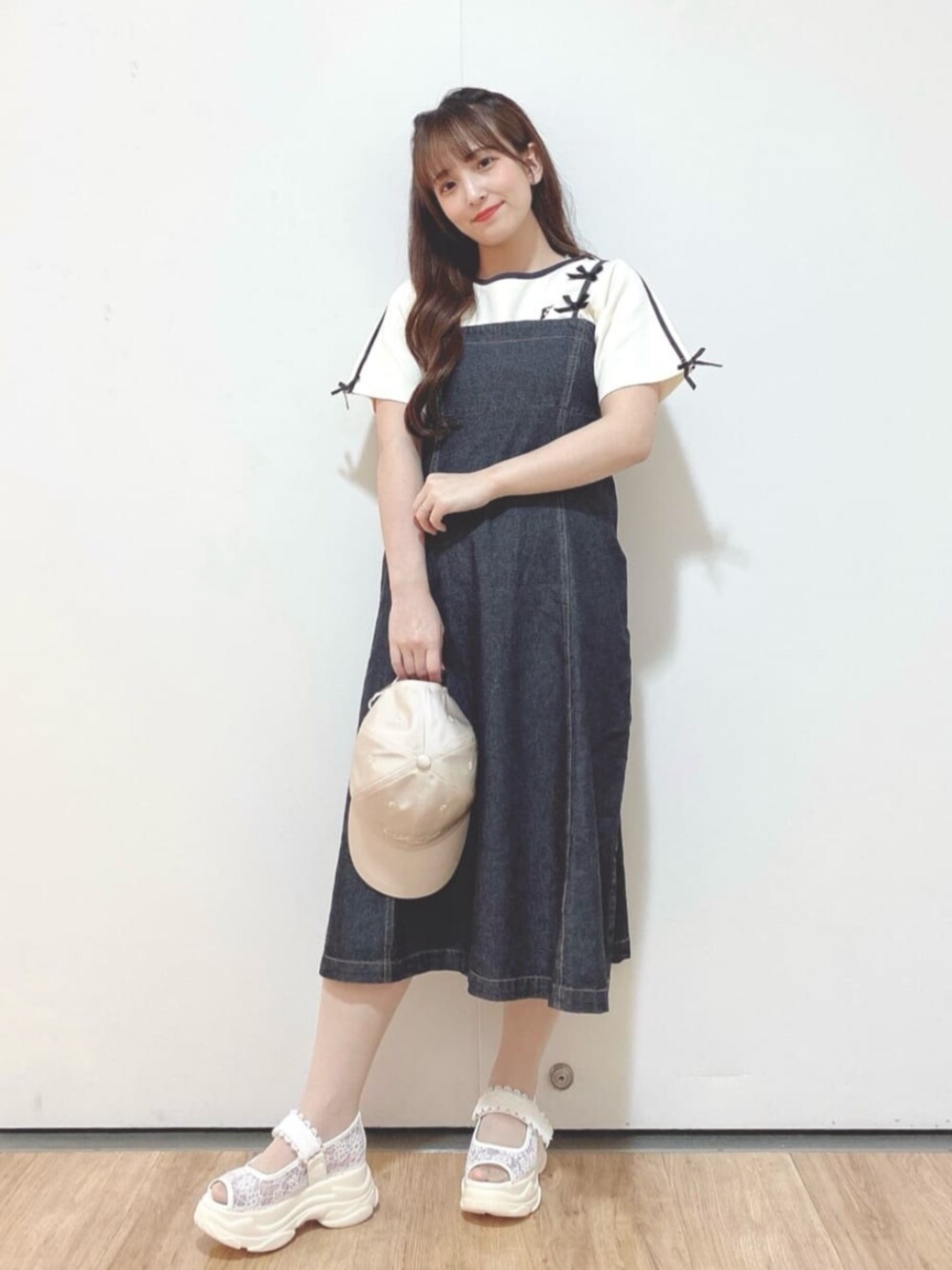 夏のお出かけは可愛く楽ちんに♪ Tシャツにキャミワンピース合わせのカジュアルコーデですが所々にリボンを入れる事で可愛さも演出🎀 【Tシャツ】 ツルッとした素材で着やすさ◎ 袖のリボンやラインがスポーティな印象に! 二の腕が隠れる丈で安心です(^^) 【キャミワンピース】 アジャスターで長さ調節可!TシャツのF刺繍を見せるために今回は長めにしました✨ 薄いデニム生地で夏も涼しく着れます♪ 体にフィットしないデザインなのでゆったりで楽です! 【キャップ】 サテン素材が可愛いです! いろんなコーデに合わせたい方はIVORYがおすすめ♡ 後ろで大きさ調節できます! 【サンダル】 スニーカーサンダルなので歩きやすいです! 程よく身長も盛れるので低身長には助かります🥺 150cm イエベ春 骨格ウェーブ 足のサイズ 22.5cm