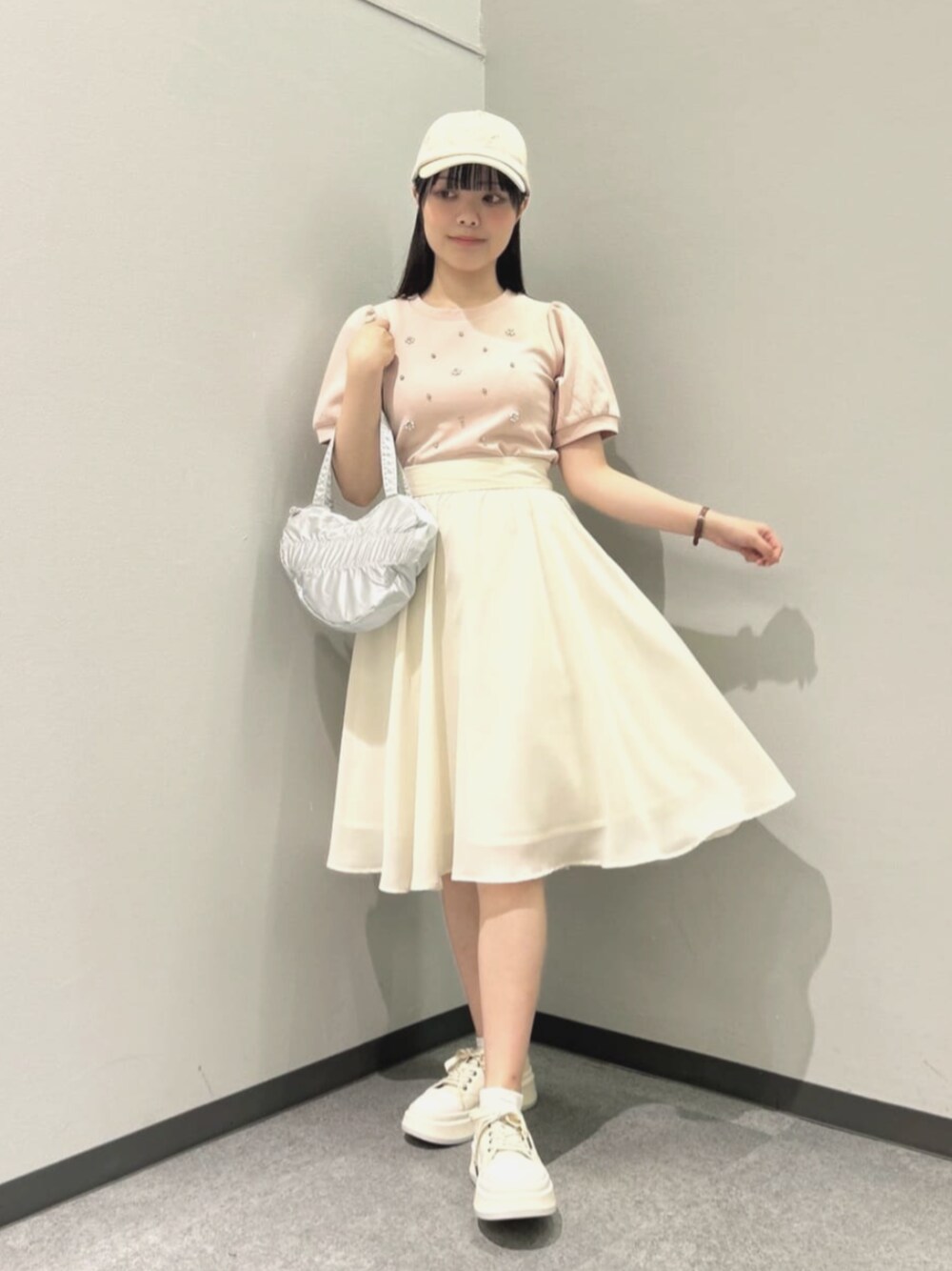 𝘗𝘪𝘯𝘬×𝘪𝘷𝘰𝘳𝘺 カジュアルガーリーコーデ🤍 ガーリーなお洋服にスニーカー,キャップといったカジュアルアイテムをプラス✔️ トレンド感のあるコーデに挑戦してみました♩ トップス… きらきらビジューとパールがキュートなアイテム。ふんわりとしたお袖がしっかりと二の腕をカバーしてくれます◎ スカート… ベルトを外して着用しております。裏地付きなので透け感は気にならずに安心して履けました。 ウエストをきゅっとしめてくれる形なので、コンパクトなトップスとも合わせやすかったです◎ ベルトを付けると、マリン系,プレッピー系のコーデにもぴったりなので色んな場面で活躍しそうです。♡ • + . ˙ ✦ ♡ㅤ°. • °. ✿ * • + . ˙ 🕊️【𝗌𝗍𝖺𝖿𝖿 𝗉𝗋𝗈𝖿𝗂𝗅𝖾】 身長:153cm 骨格:ウェーブ パーソナルカラー:イエベ春 顔タイプ:フレッシュ シューズサイズ:22~22.5cm(Sサイズ)