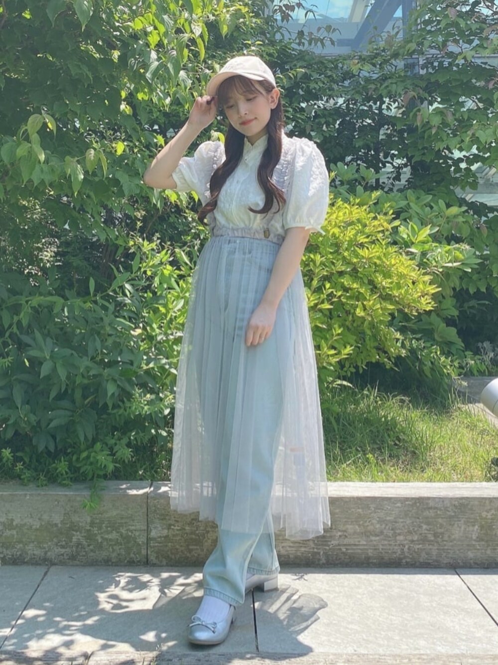 トレンドを意識したレイヤードコーデ♡ カジュアルなアイテムにチュールスカートを合わせることでガーリーな印象に! 【ブラウス】 フラワージャガード柄が可愛いアイテム! 薄い素材でサラッとしていて着やすさ◎ 【チュールスカート】 ウエストゴムで履きやすさ◎ フリルのサスペンダーは取り外せます! パンツとの相性◎ 【デニムパンツ】 サイズ1を着用! 伸縮性があっては着やすいです♪ 150cmの身長で引きずらない長さでした! 【キャップ】 サイズ調整ができて日光から守ってくれるので夏におすすめ! 【パンプス】 22.5cmでSサイズがぴったりです! 柔らかい素材で靴擦れしにくいですよ(^^) 150cm イエベ春 骨格ウェーブ 足のサイズ 22.5cm
