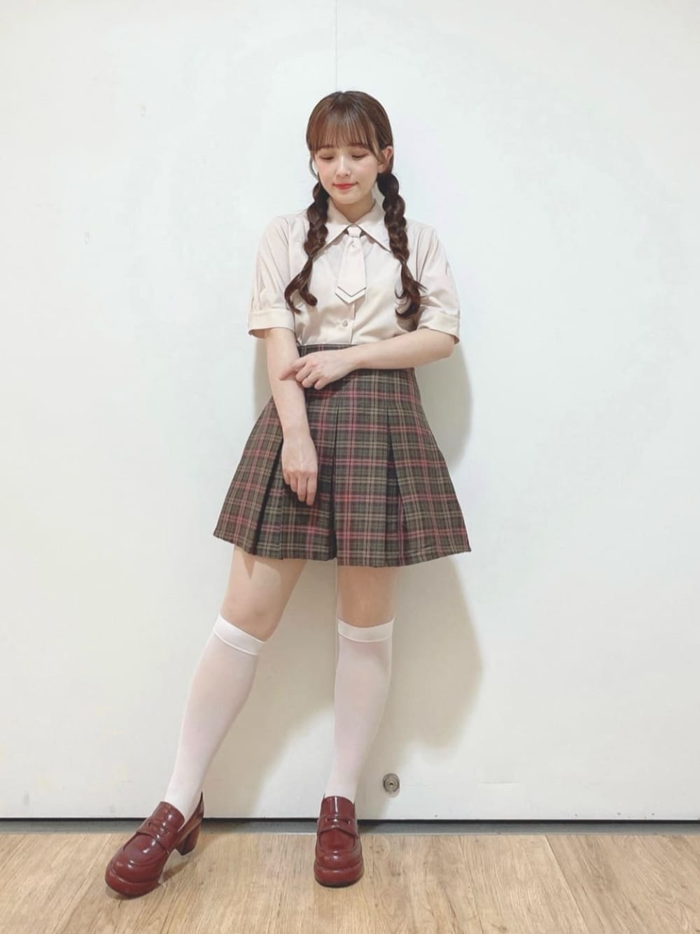 秋まで着れるブラウンプレッピーコーデ📗 【ブラウス】 肌馴染みいいピンクで甘くなりすぎなくておすすめです♡ 中が透けにくいので夏でも安心して着れます! プレッピーコーデには欠かせないネクタイがポイントです★ 【スカート】 サイズ1を着用!長さ、ウエスト共にちょうどよかったです♡普段のフィントのフリーサイズと同じくらいです♪ ブラウン地にピンクのラインが可愛くて絶対ピンクのブラウスと合わせたい!と思いました🩷 【バッグ】 プレッピーコーデにはサッチェルバッグですね! ブラウンは色みも落ち着いていてどの季節でも使えます! 持ってない方は、まずブラウンから始めるのがおすすめです♪ 【ローファー】 22.5cmでSサイズが少しゆとりありましたが許容範囲内でした!中敷き入れるのをおすすめします♡ なかなかない色みで秋らしさを演出できます✨ ブラウンコーデに差し色としておすすめです! 150cm イエベ春 骨格ウェーブ 足のサイズ 22.5cm