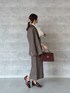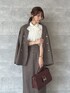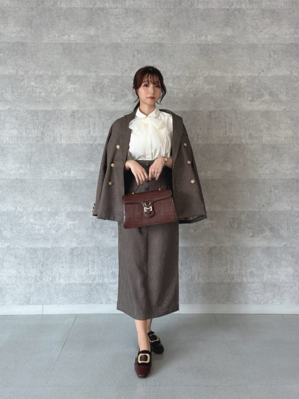 セットアップで着こなす、 クラシックなスーツライクStyle* ✓𝘫𝘢𝘤𝘬𝘦𝘵 柔らかい生地感で グレードを感じさせるジャケット♡ 身長150cmでサイズ1を着用しています。 長すぎない丈にややオーバーシルエットで こなれ感を演出できます* 肩幅も大きすぎないサイズ感なので、 小柄さんにおすすめのサイズです! ✓𝘣𝘭𝘰𝘶𝘴𝘦 リボンタイは取り外し可能なので、 オフィスシーン等でも活躍できます。 やや透け感がある為、 インナーを入れてきていただくのが○ ✓𝘴𝘬𝘪𝘳𝘵 ジャケットと同じ生地を使用した タイトスカート♡ 身長150cmでサイズ1を着用しています。 腰周りに少し入っているタックで 少しふんわりするシルエットになり、 骨格ウェーブさんも 履きやすいシルエット* 後ろにスリッドを入っているので、 歩きやすいデザインです! ✓𝘴𝘩𝘰𝘦𝘴 22.5cmでSサイズ着用。 ややかかと部分に余裕がある為、 同じ足サイズの方は 中敷やかかとクッションを 入れていただくと履きやすくなります* ✓ 𝘣𝘢𝘨 長財布や小さめのポーチもスッキリ入る 普段使いにおすすめのサイズ感♡ 金具部分はマグネット使用なので、 開け閉めも簡単にお使いいただけます*