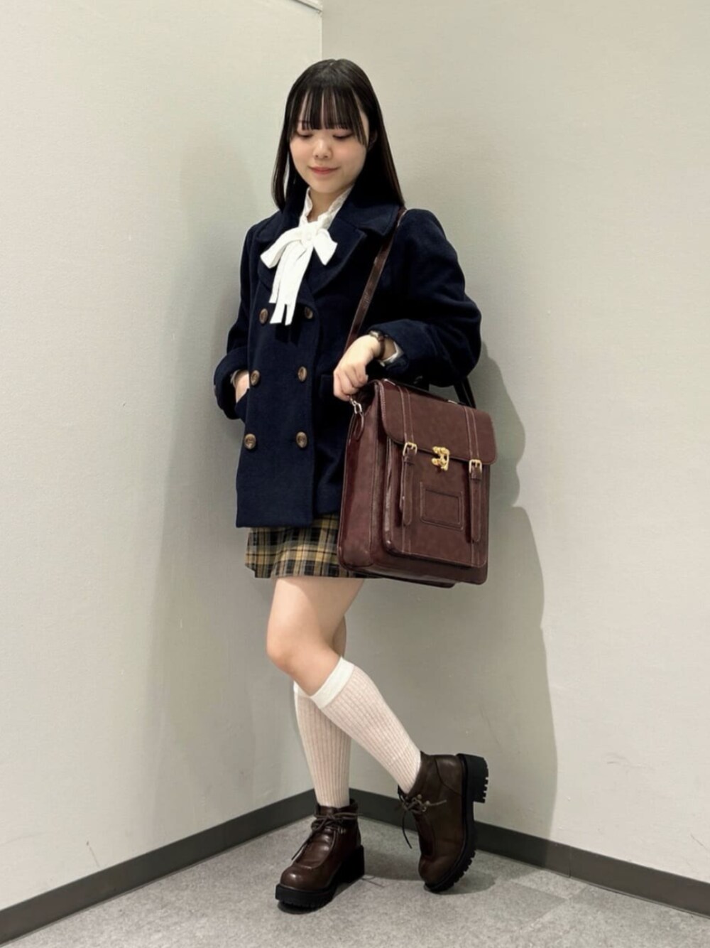 海外の制服風♡プレッピーコーデ💼 コート… ふっくら厚みのある生地感でとっても暖かかったです☺️軽くて、ややゆったりとしたサイズ感なので、気軽にサッと羽織りやすいところも嬉しいポイント◎ ネイビーはカチッとしたコーデにもプレッピーなコーデにも合わせやすくデイリー使いしやすいお色味だと思います♡ ブラウス… アウターを重ねた時にも胸元のリボンやレースをあしらったスタンドカラーがポイントになってくれるブラウス♡ タブを留めるだけで簡単に可愛いリボンが作れちゃいます🎀 スカート… カレッジな雰囲気が漂うチェック柄スカート。ウエストはゴム入りなのでニットなどを厚手のトップスもインできそうだと感じました◎ • + . ˙ ✦ ♡ㅤ°. • °. ✿ * • + . ˙ 🕊️【𝗌𝗍𝖺𝖿𝖿 𝗉𝗋𝗈𝖿𝗂𝗅𝖾】 身長:153cm 骨格:ウェーブ パーソナルカラー:イエベ春 顔タイプ:フレッシュ シューズサイズ:22~22.5cm(Sサイズ)