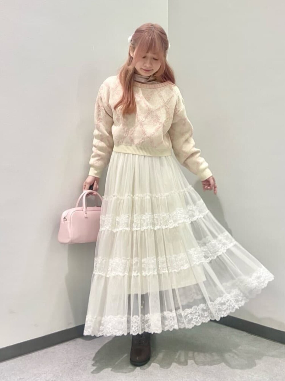 ベロアの上品トップスをレイヤードでカジュアルダウンして着てみました! 【トップス】 pink ツヤ感のあるベロアトップス。 やや毛足があり伸び感もあるベロア生地で、首元後ろのパール釦で着脱するタイプです。 ループがゴムなのでパール釦も留めやすかったです! 首元はぴたっとしておらず肩にタックが入っていてピタピタ感が出づらいのが◎ 【ニット】ivory/pink リボン柄の編み地が可愛いニット。 やや短めなのでボトムにインせずに着るのもオススメです♡ 【スカート】off white 《リアルバイアイテム》 ボリュームのあるチュール&レースのスカート。 ウエストゴムで着脱らくちんなのが◎ 真っ白な色味でシーズンレスに着回せますよ♪ 150cmで足首まであるロング丈です。 裏地はありますが透け感が出やすいので一枚ペチコートやペチパンツを履いて重ねるのがおすすめです! 【バッグ】light pink シャイニーなピンクカラーがガーリーなバッグ。 横長型でペットボトルも入ります◎ 外ポケット2個はフラップ付きでリップやハンドミラーなど入りそうです! 【ブーツ】brown/M 足をすっきりしたシルエットに見せてくれるブーツ。 ヒール高6cmほどでしっかり盛れるのでロング丈アイテムを着る時に重宝します♡ 《プロフィール》 150cm/23.5〜24(M)/骨格ウェーブ/ブルベ夏