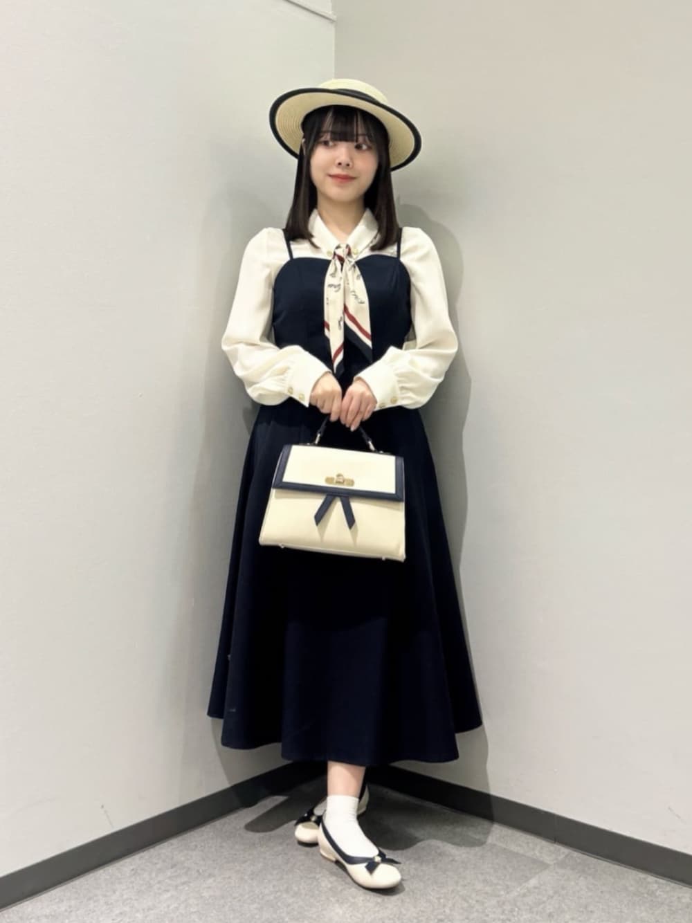 𝑆𝑝𝑟𝑖𝑛𝑔 𝑎𝑛𝑑 𝑆𝑢𝑚𝑚𝑒𝑟 𝐶𝑜𝑙𝑙𝑒𝑐𝑡𝑖𝑜𝑛 ‟𝑁𝑖𝑐𝑜𝑙𝑒” 🩰💐 バックスタイルがポイント🪄クラシカルコーデ🥀 キャミワンピース… フィットアンドフレアーのシルエットがスタイルアップを叶えてくれるキャミワンピ。 ウエスト部分がかなり引き締まってみえますが背中部分に伸びのいいシャーリングゴムが入っており、リボンもお好みのサイズ感で結ぶことができるので、締め付け感は少なく着心地も◎ 上半身のボリュームが気になる方にも華奢さんにもオススメしたい一品です。 肩紐の調整で、着用写真より丈を短くすることも、長くすることも可能になっております。 スカート部分は生地がたっぷり使われており歩くだけでふんわりと広がります♡ ブラウス… フレンチムードが漂うスカーフ付きブラウス。ややとろみ感のある肌触りのいい生地感でした。スカーフは取り外し可能なのでスカーフなしのスタイルでも◎ゴールドボタンがより際立ちそうです♡ スカーフをお手持ちのシャツやワンピースと合わせるアレンジもおすすめです✔️ シューズ… 足のサイズ21.5~22センチ(最近測り直しました!💦)でSサイズを履いております。 やや縦幅があまるので中敷は必須でしたが、横幅はぴったりめ、底がふかふかしており太めのヒールで安定感も抜群でした♡ シューズと配色デザインがおそろいのバッグやキャノチェを合わせてとびきりクラシカルなコーデにしてみました🎀♡ • + . ˙ ✦ ♡ㅤ°. • °. ✿ * • + . ˙ 🕊️【𝗌𝗍𝖺𝖿𝖿 𝗉𝗋𝗈𝖿𝗂𝗅𝖾】 身長:153cm 骨格:ウェーブ パーソナルカラー:イエベ春 顔タイプ:フレッシュ シューズサイズ:21.5〜22センチ
