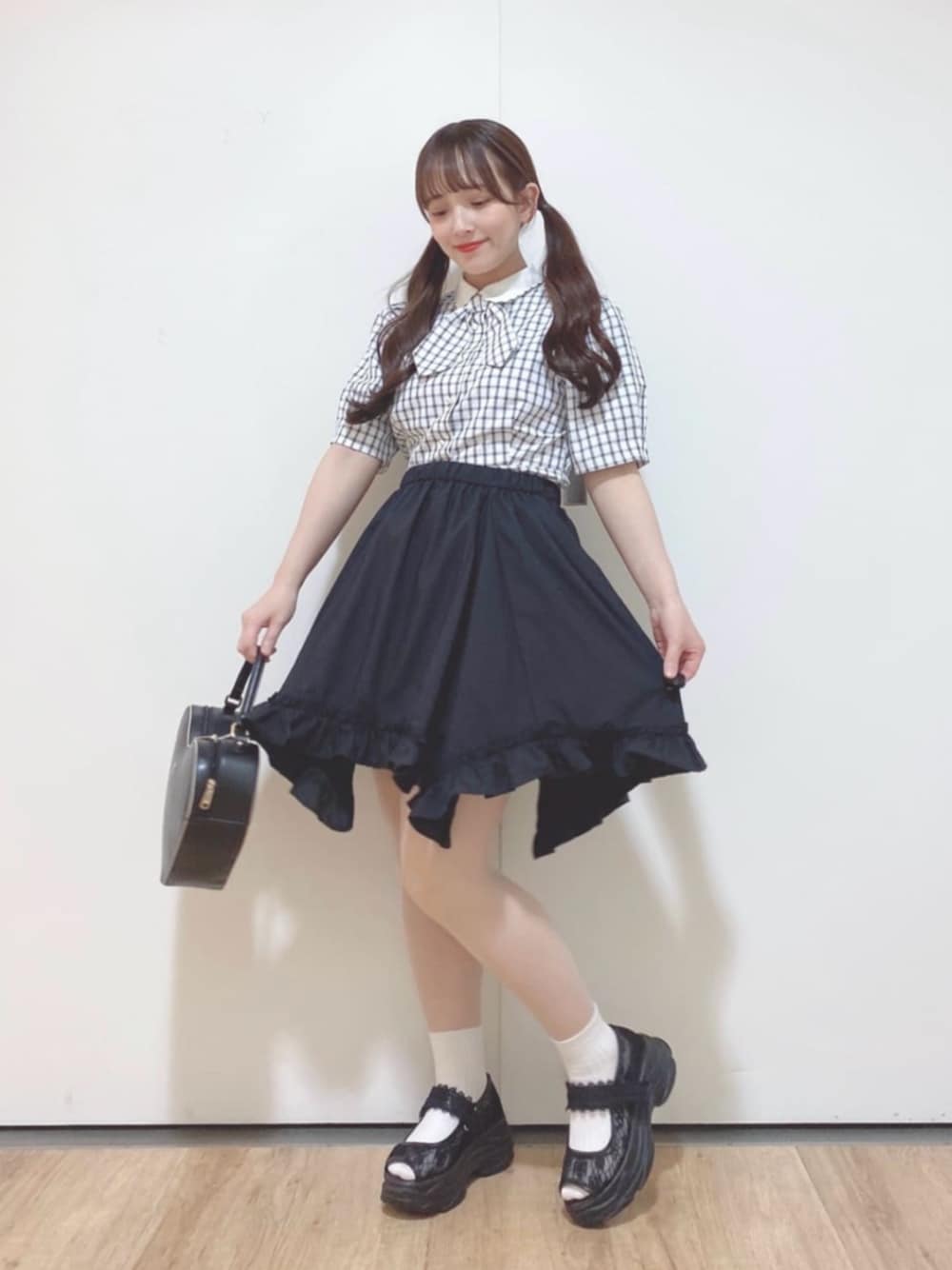 モノトーン🖤ガーリーコーデ 【ブラウス】 夏らしいチェック柄でオシャレ度アップ! サラッとしていて乾きやすそうなので汗をかいても◎ タイはボタンで取り外しできます! 【スカート】 ウエストが全部ゴムでとっても履きやすいです✨ ミニ丈ですが長さが違うので程よく足を隠してくれます(^^) 黒なので秋まで長く着れますよ♪ 【バッグ】 ハート型が可愛いバッグ! 柔らかくて物が入れやすいです🖤 ショルダーにもなるストラップ付き! 【サンダル】 厚底ですが履きやすさ◎ 22.5cmでSサイズがぴったりです(^^) 150cm イエベ春 骨格ウェーブ 足のサイズ 22.5cm