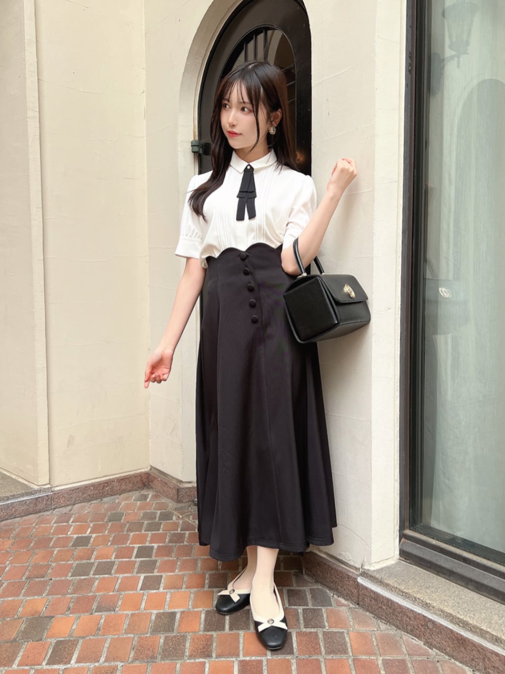 シックなモノトーンスタイリングのご紹介です♪ 控えめながらもきっちり感が出るボウタイブラウスに、クラシカルなボタン付きフレアスカートを合わせた上品スタイルにしました♡ モノトーンでまとめつつ、タイリボンや丸みのあるバッグで可愛らしさもプラスしてみました。 お出かけやデートにもぴったりの、大人コーデです。 -model profile- 身長:157㎝ 骨格:ウェーブ✕ナチュラル パーソナルカラー:ブルベ シューズサイズ:23.5cm M