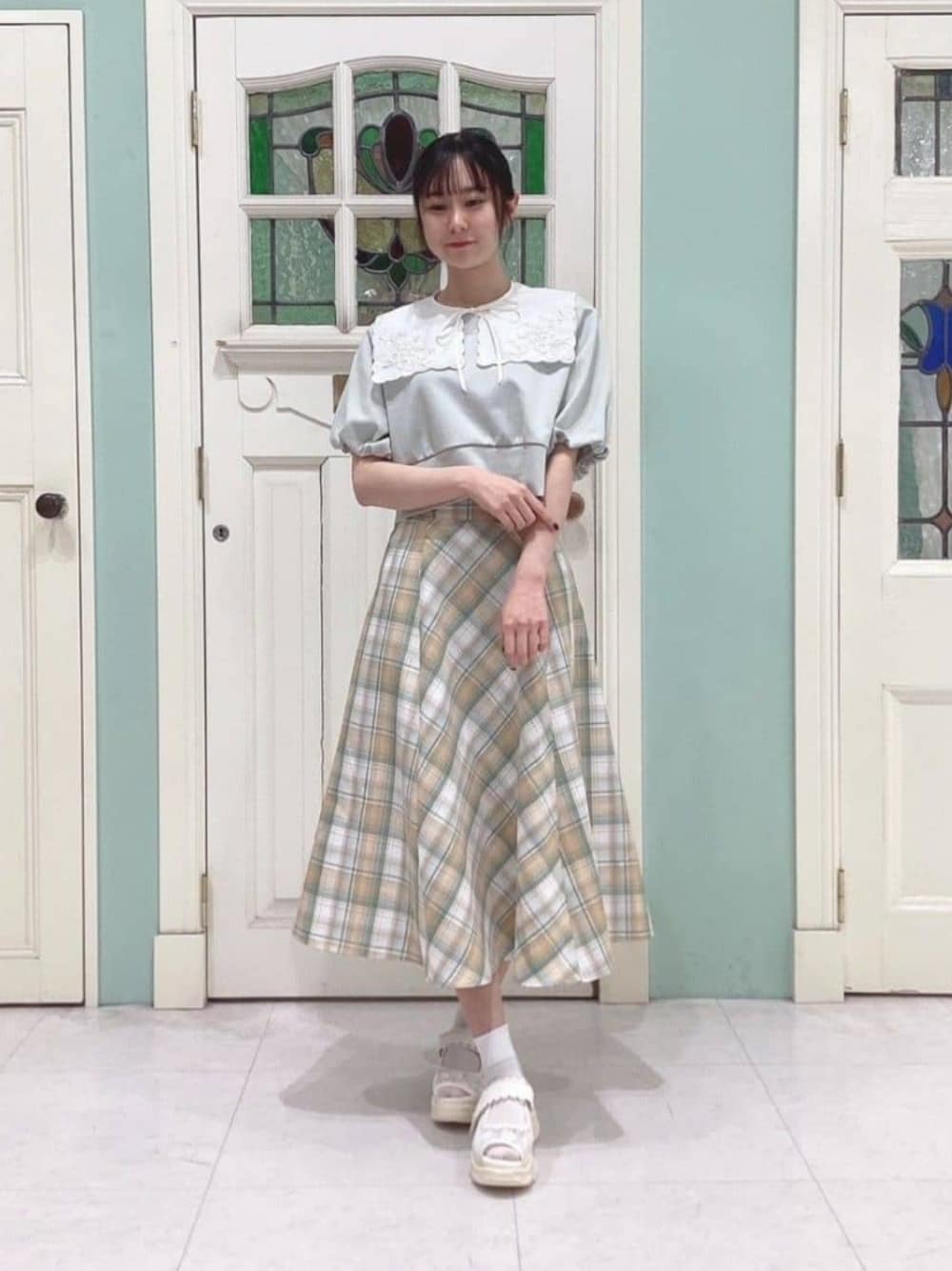 ☆スカート リアルバイアイテムです♪ 両サイドポケットがついておりとても便利です! 後ろが少しゴムタイプになっており、伸縮性が有ります。 ☆トップス 今回は肩のシアーリボンを取り外して着用しました。 リボンが着脱可能なのでコーデに合わせてお好みで変えられます! ☆付け襟 Tシャツやスウェット等 結びリボンタイプなので簡単に着脱出来ます♪ ☆サンダル 厚底ですがとても安定していて長時間疲れにくいです! 158cm/骨格ウェーブ/ブルベ冬/足のサイズ23.0〜23.5