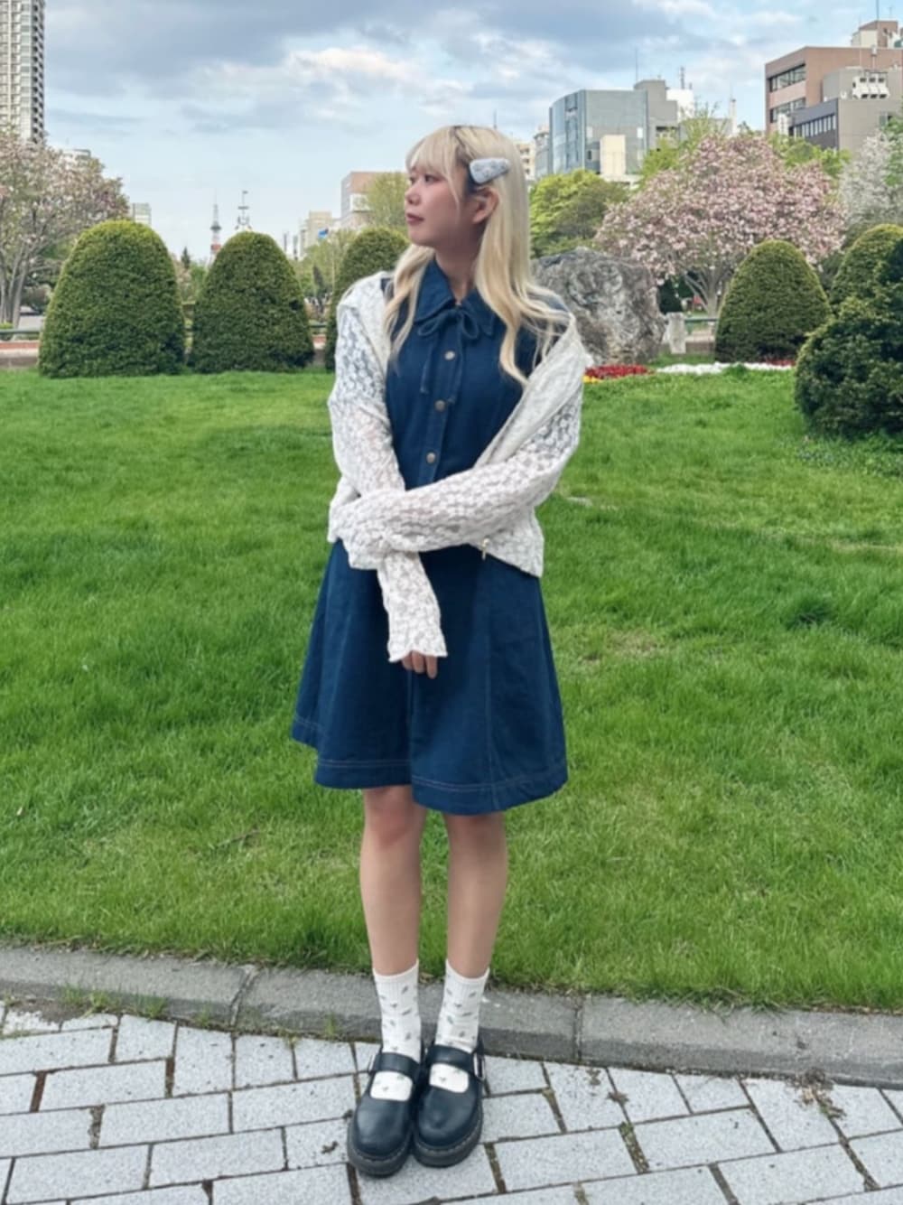 動きやすいデニムワンピースでお散歩コーデ♪ 暖かくなりましたが、気温差がある日は一枚でも羽織りがあると安心! デニムのカジュアルな雰囲気をレースパーカーで甘めに仕上げました♡ もっと暖かくなったらデニムワンピース一枚でお出かけしてくださいね♪ 153cm/骨格ストレート/イエベ春