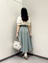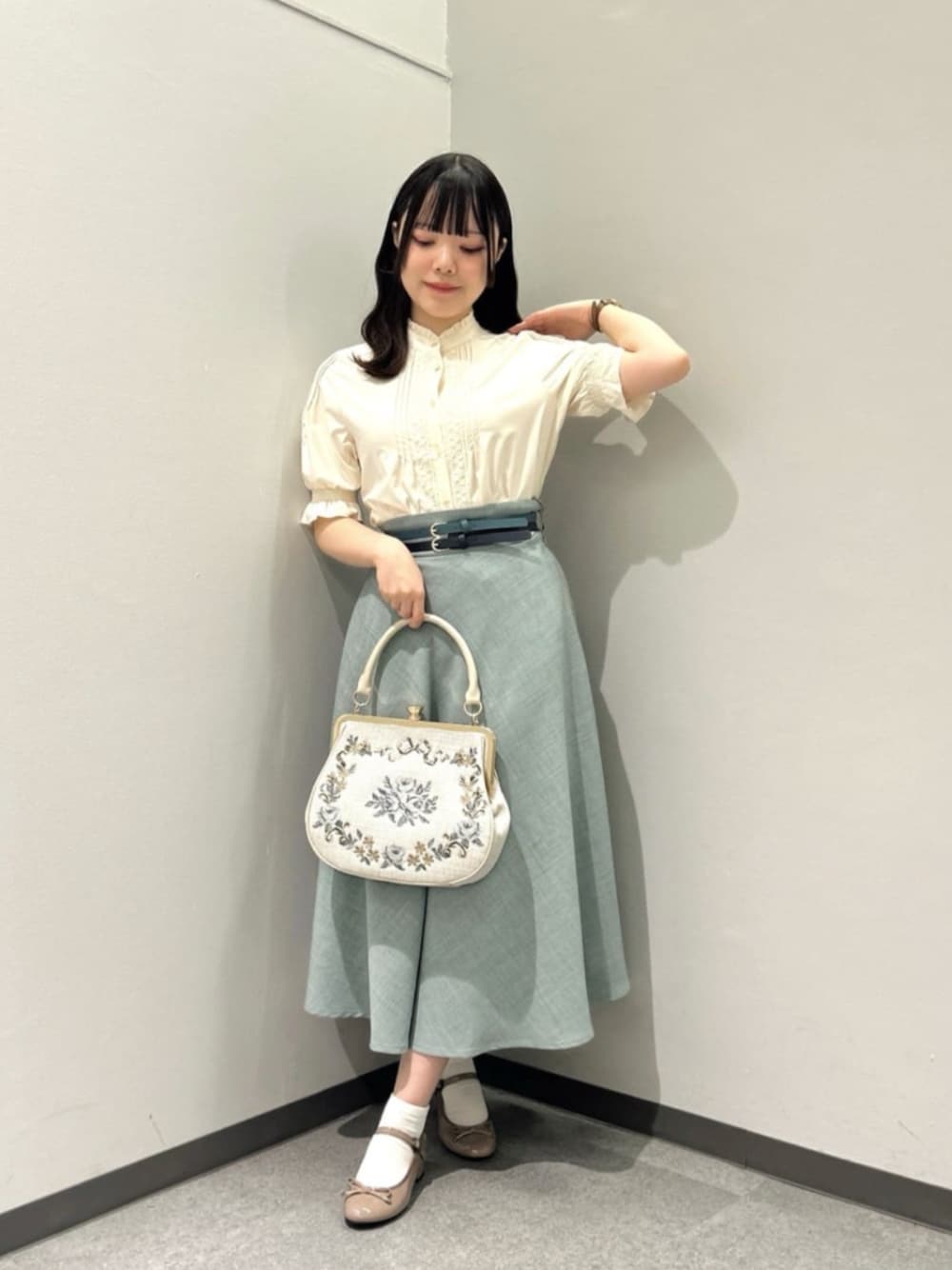 ヴィンテージライクなクラシカルコーデ🥀 トップス… フロントやお袖にあしらわれたローズ刺繍が印象的な、クラシカルなブラウス。 着用カラーの「light beige」は、ほんのりヴィンテージライクなムードも漂います♡ 首が短めでスタンドカラーが苦手な私でも、衿のフリルが控えめなので挑戦しやすかったです✨ スカート… 涼しげなblue greenのカラーが、夏にぴったりな1枚🍃 ダブルベルトがアクセントになって、コーデにメリハリをプラスしてくれます。 シルエットもとても綺麗で、ウエスト周りをきゅっと見せつつ、背中のゴムが柔らかいので締め付け感なく快適でした◎ バッグ… ローズやリボンの刺繍が目を惹く、クラシカルムードたっぷりのがま口バッグ🥀 写真で見るより実物がさらに可愛くて…!😵♡ 見た目以上に収納力もあって、500mlのペットボトルもすっぽり入りました!荷物が多めな私でも、普段使いできそうです✨ シューズ… 晴雨兼用のレインパンプス🌧️ Sサイズを着用しています。縦幅に少し余裕はありますが、ストラップ付きで安定感ばっちり◎雨の日のお出かけも安心です☂️ • + . ˙ ✦ ♡ㅤ°. • °. ✿ * • + . ˙ 🕊️【𝗌𝗍𝖺𝖿𝖿 𝗉𝗋𝗈𝖿𝗂𝗅𝖾】 身長:153cm 骨格:ウェーブ パーソナルカラー:イエベ春 顔タイプ:フレッシュ シューズサイズ:21.5〜22センチ