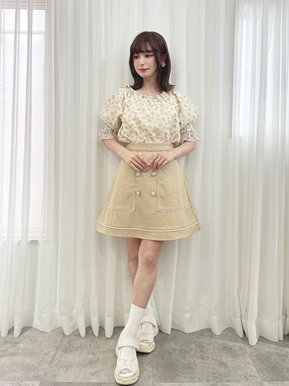 小花柄ブラウスとイエローベージュのAラインスカートで、明るくナチュラルガーリースタイルに♡ ふんわりとした袖と、透け感のあるディテールが女性らしさを引き立ててくれます。 ウエストインすることで、全体のバランスがすっきりとまとまります◎ 足元はソックス×レースシューズで、抜け感と可愛さをプラス♪ 春夏のお出かけにぴったりな、優しい印象のフェミニンコーデです。 -model profile- height: 152cm frame:ウェーブ personal color:イエベ春