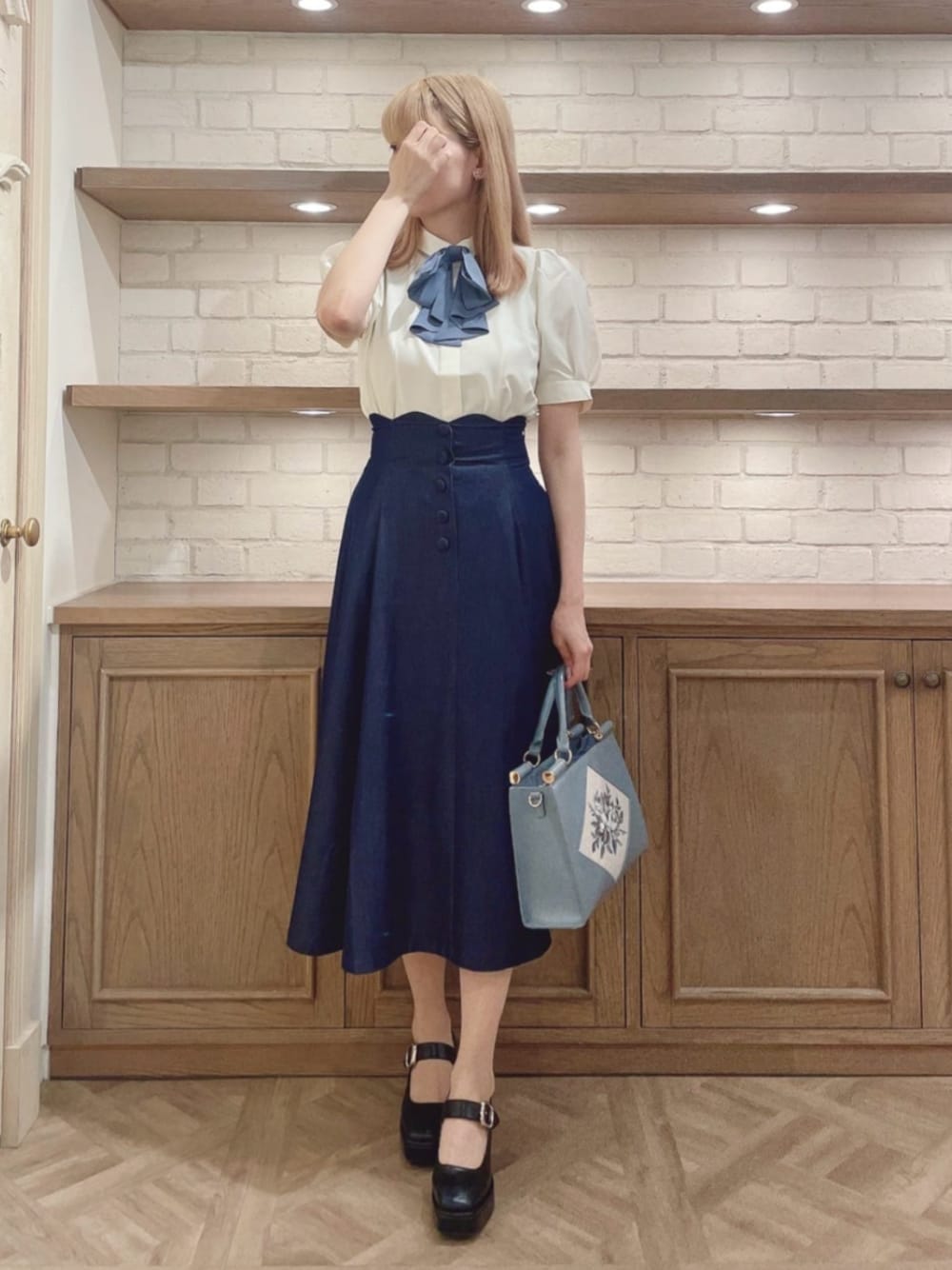 クラシック×カジュアルコーデ🧁♥ *ブラウス ブラウスの色みは黄色みがあり、実際に見ても色みを感じられます! 夏らしくてかわいいです💙 大きめリボンですが、着てみると派手すぎず、 胸元のポイントに♪ リボンはボタンで取り外せるタイプなので、色んなコーデで楽しんでいただけますよ☺︎ 同様のボタンで取り外しできるアイテムを お持ちの方はぜひ入れ替えてオリジナルのアレンジをしてみてくださいね? *スカート サイズ1で履いており、ウエストのフィット感はジャストサイズでした◎ 綺麗なシルエットで見た目だけでなく履いた時も感動します🥹🫶 こちらの生地感もツルっとしているので軽やかに! フロントのボタンはデザインなのでファスナーで着脱できます。 ふんわりカジュアルな雰囲気で合わせられるので普段使いにとってもおすすめです✨ 【 163cm / ブルベ / 23.5(M size) 】