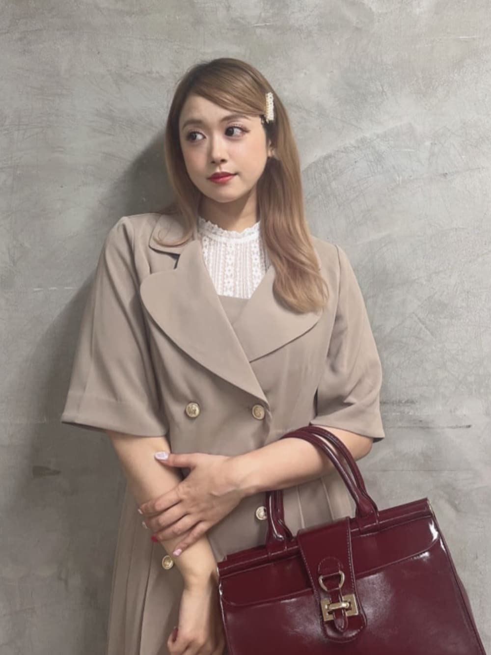 ▶︎jacket…サラッとした生地感で重すぎないのですが、しっかりしていてインナーによっては長く着れそうです。 袖内側に釦がついていて、ケープ状にする事が出来ます。 ▶︎inner…総レースで華美になり過ぎず、首元も詰まっているので色んなアイテムと合わせやすそうです◎定番アイテムなので1枚持ってると便利かと思います! ▶︎jumperskirt…背中部分に広めのシャーリングが入っていて良く伸びるので着やすいです。 太めのプリーツのおかげで子どもっぽくならずに着ることができます◎ ゴールド釦が可愛いのでコーデのアクセントになりそうです! ▶︎shoes…チャンキーヒールで安定感のあるパンプスで足も疲れにくい設計です◎ これからの時期にピッタリな深いブラウンのカラーが、新作のどのお洋服にも合うので優秀パンプスです! ▶︎bag…パンプスのカラーと合わせて纏まりを出しました。このサイズ感はペットボトル、折りたたみ傘、長財布がしっかり入るのでお出かけには持ってこいのバッグです◎