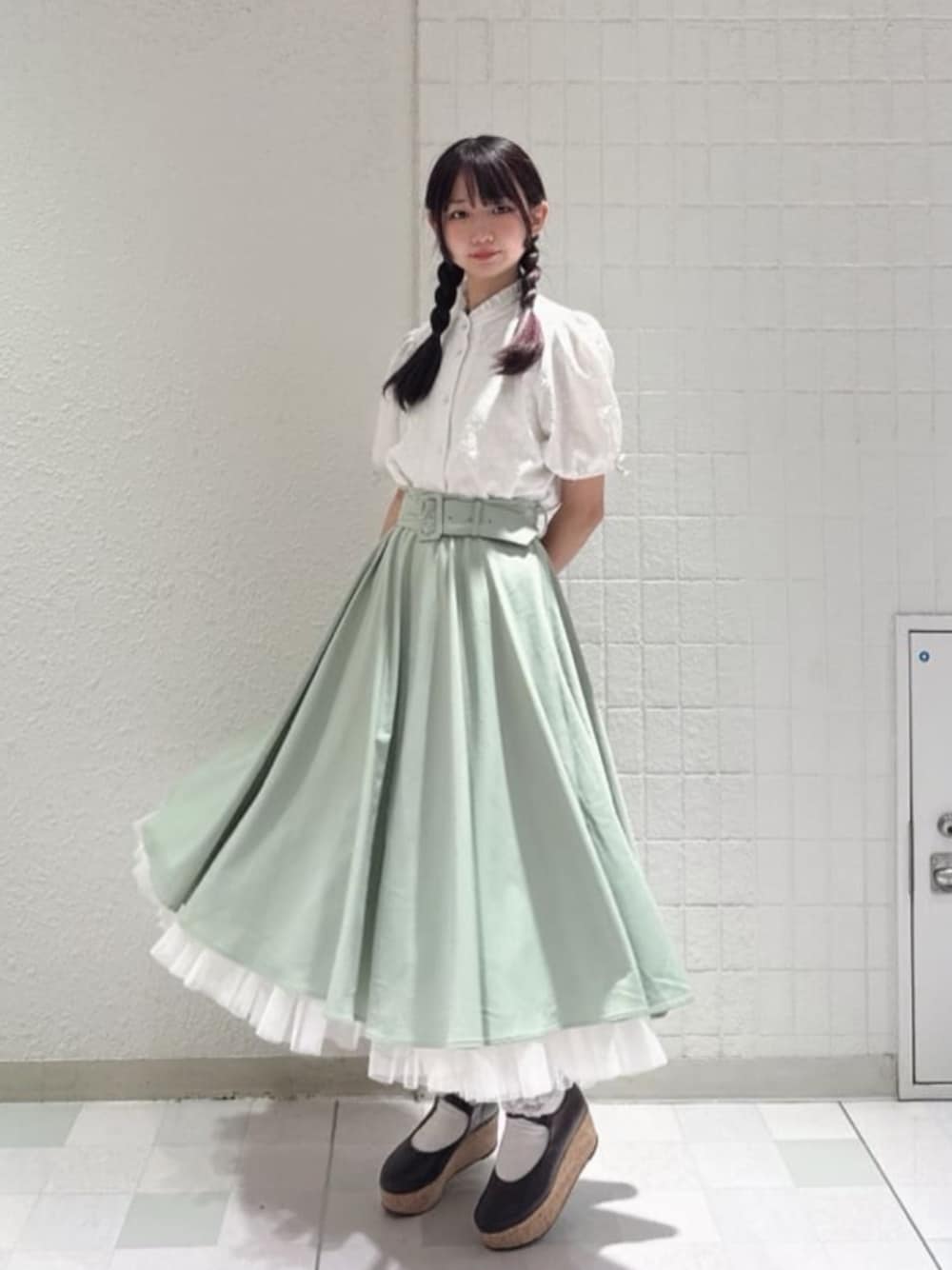 夏色コーデ💚👒 ⟡.·*.··············································⟡.·*. 今回は大人気のパニエサーキュラースカートを使ってコーディネートしました! 【ブラウス】 小花模様が可愛いジャガード生地のブラウス❤︎ 暑い日でもベタつかずサラッと着られるので去年からリピートしてます🎶 袖口のリボンもとても可愛いです🎀 【スカート】 大人気パニエサーキュラースカートは今回裏地が接触冷感になったこともありとても履きやすくなりました✨ 少し動くだけでふわっと広がるシルエットが写真映え間違いなしです! 【シューズ】 厚底のパンプス夏に持ってこいのコルク素材でとても可愛いです🎀 前回発売時、大人気でGETできなかったので今回やっとGET出来ました❤︎ よければお出かけコーデの参考にしてください😊 ⟡.·*.··············································⟡.·*. - profile :- 158cm/24.5cm/骨格ウェーブ(ナチュラル寄り)/イエベ春