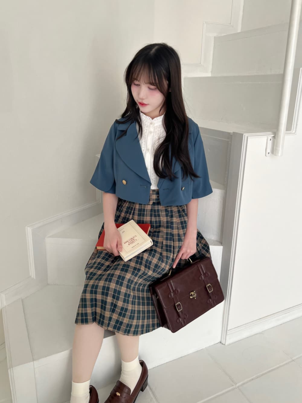 クラシカルなチェック柄スカートに、コンパクトなショートジャケットを合わせた上品コーデ✨ ウエストマークと短め丈のジャケットでスタイルアップ効果も◎ 落ち着いたブルー×ブラウンの色合わせが秋らしく、大人可愛い雰囲気に♡ 今すぐ着られる秋先取りの装いです。 -model profile- 身長:157㎝ 骨格:ウェーブ✕ナチュラル パーソナルカラー:ブルベ シューズサイズ:23.5cm M