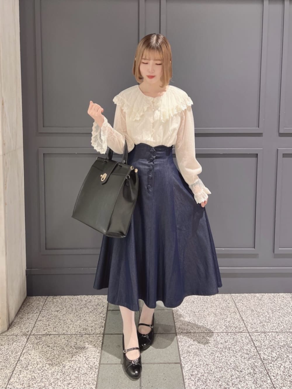 こんにちは🐈⬛⸝⋆ リアルバイアイテムのブラウスを使って大人可愛いコーデを組んでみました♡ 繊細なレース使いが堪らないブラウス…✨ 大きな衿でお顔周りも華やかになります♡ こちらは受注会時から狙っていたのですが、無事にお迎えしました🥹 ペプラムシルエットなので、ハイウエストボトムにインする着方もできアレンジも楽しんでいただけます* 合わせたスカートは、サイズ1を着用しています!ウエストはややゆるめですが、生地が軽めなのでずり落ちる心配は無いです◎ パンプスは足の甲の部分にストラップが付いているため、脱げにくく足にフィットしてくれます♩ ヒールも4cmとそこまで高くないため、ヒール初心者さんでも挑戦しやすいと思います♡ 少しでも参考になれば嬉しいです👼🏻 いいなと思った投稿は♡でお気に入りしてね︎︎︎☺︎ ( 160cm / ブルベ夏 / 骨格ウェーブ / shoes size 23.5(M))