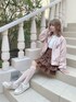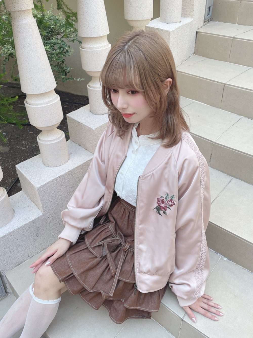 光沢のあるサテンのブルゾンは、バラの刺繍がクラシカルでコーデに上品な華やかさをプラスしてくれます◎ チョコレートカラーのティアードスカートはリボン付きのデザインが乙女心をくすぐり、歩くたびふわりと揺れるシルエットが魅力的♡ 足元は白ソックス×スニーカーで、甘さとカジュアルさのバランスが絶妙♪ ちょっぴり特別な日のお出かけにもぴったりです♡ -model profile- height: 152cm frame:ウェーブ personal color:イエベ春