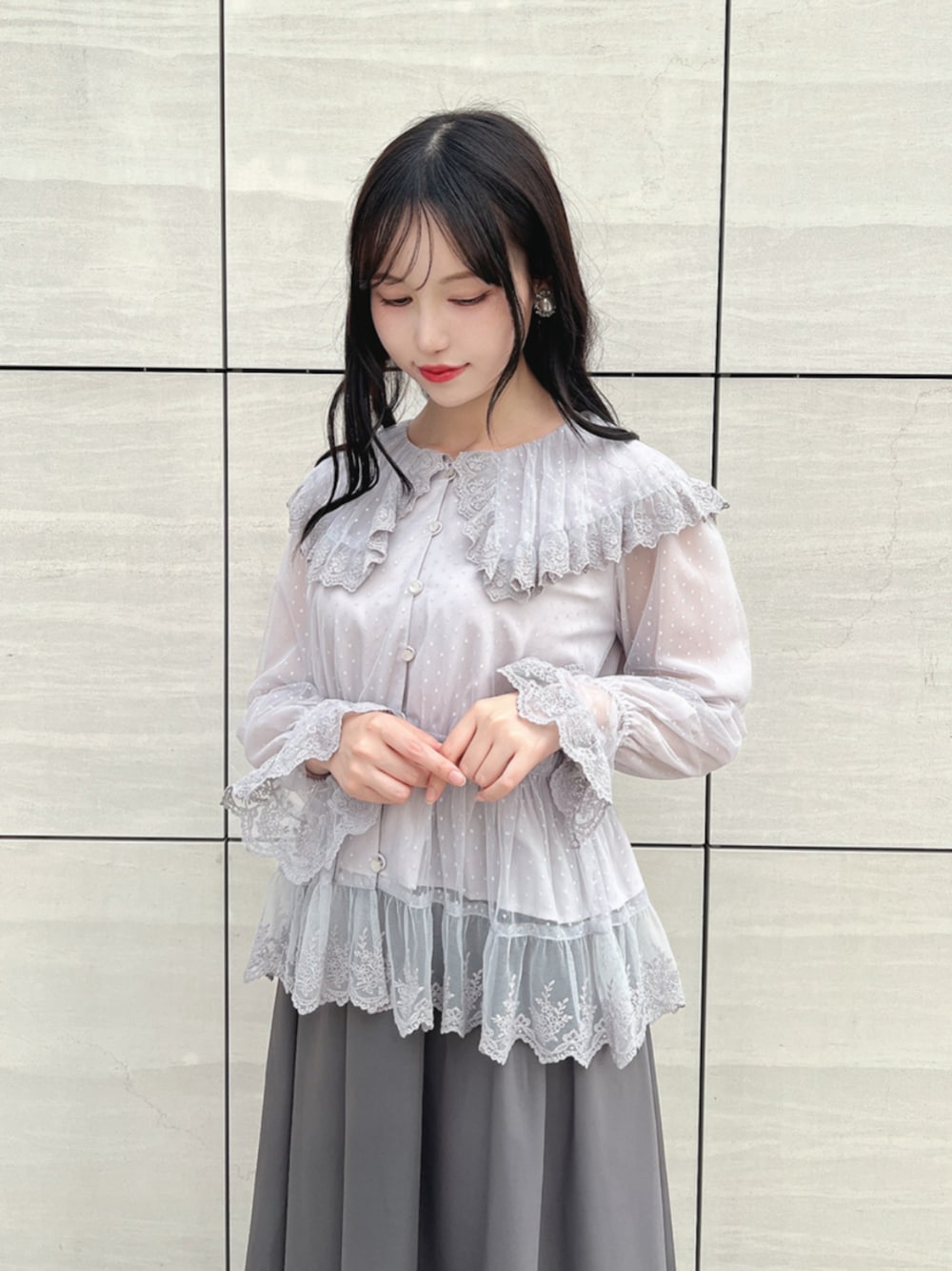 全体的に淡くてやわらかい色合いが、落ち着きと品の良さを演出してくれるコーデ✨ ふんわりとしたシフォン素材に、繊細なレースが贅沢にあしらわれたブラウスは、乙女心をくすぐる一枚。 くるみボタンや大きめの襟元も、レトロでクラシカルな雰囲気を漂わせます♡ 足元の艶のある黒のストラップシューズが程よく引き締め役に🌹 落ち着いたカラーとレトロなムードが、美術館や博物館にピッタリです🖼 -model profile- 身長:157㎝ 骨格:ウェーブ✕ナチュラル パーソナルカラー:ブルベ シューズサイズ:23.5cm M