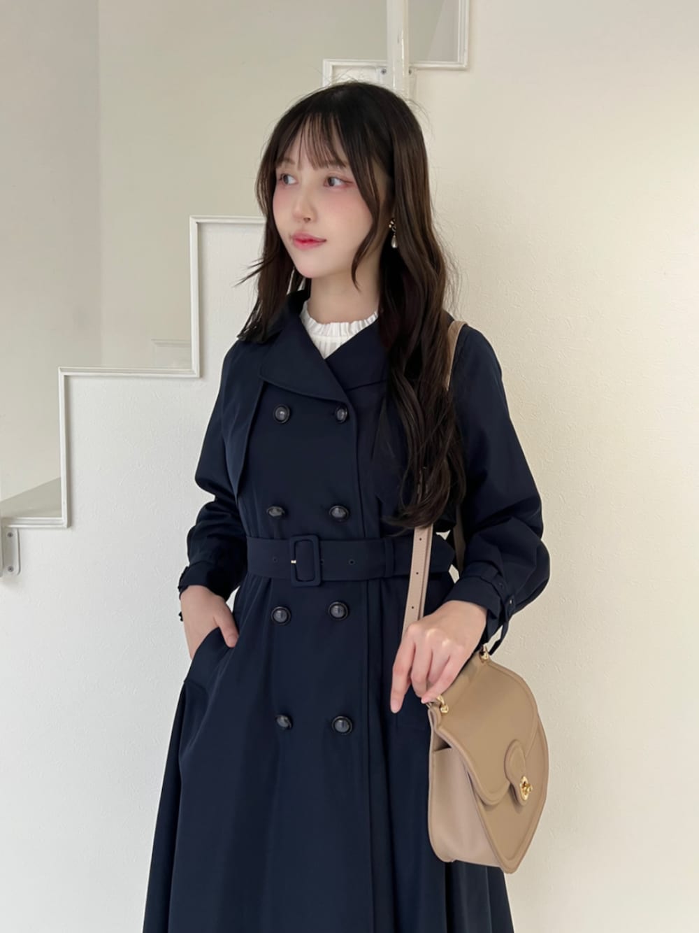 オフィスシーンにもピッタリな上品コーデ👠 シンプルでありながらもクラシックな魅力感じるトレンチコート。 ダブルボタンのデザインと、ウエストのベルトが女性らしいラインを作り、着るだけで優雅に見せてくれます。ネイビーはどんな場面にも合う色なので、デイリーに活躍すること間違いなし◎ コートもスカートも撥水加工が施されているので、雨の日も安心です☂ -model profile- 身長:157㎝ 骨格:ウェーブ✕ナチュラル パーソナルカラー:ブルベ シューズサイズ:23.5cm M
