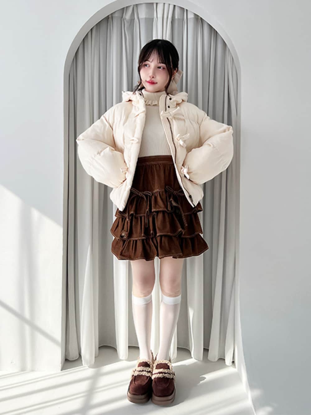 冬にピッタリなミルク×ショコラコーデ🍫 マシュマロみたいなもっちり感がたまらないアウター☁ 軽くてあたたかいのに、シルエットはふんわり女の子らしく保ってくれるのが嬉しいポイント✨ トグル釦のリボンデザインが、カジュアルになりすぎずクラシカルな甘さをプラスしてくれます🎀 ふんわり広がるティアードデザインがキュートなスカート🍫 コーデュロイ素材のあたたかみが冬らしく、動くたびにひらひら揺れてとってもロマンティックです✨ ウエスト位置が高めだから、脚を長く見せてくれるのも嬉しいポイント! シンプルだけど首元のフリルがとっても上品で、重ね着のインナーにぴったりなリブタートル♡ やわらかいリブ素材だから着心地も抜群✨ スカートにインすると、すっきりしたラインで甘すぎず大人かわいい印象に💫 -model profile- 身長:157㎝ 骨格:ウェーブ✕ナチュラル パーソナルカラー:ブルベ シューズサイズ:23.5cm M