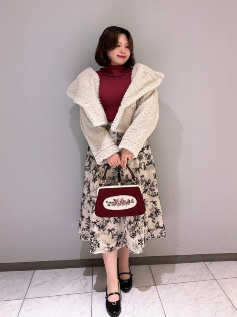 “上品なHoliday styling“ ゴージャスでHolidayらしさ満点 花柄スカートを主役にした冬コーデ♡ outer... リアルバイ検討中... 生地的に膨張するか心配でしたが 抜き襟して着ると 首元スッキリ着られました♡ tops... 釦付きリブタートルが今年も登場!! 写真ではボルドーっぽくも見えるのですが 実際の色味は濃いめのピンクで 名前の通り甘酸っぱいベリーのような 可愛いカラーです♡ bottom... 新作の花柄スカート♡ フロッキー素材でポコポコしている 異素材スカート 生地に細かくラメが散りばめられていて クリスマスシーズンにもピッタリ♡ shoes... クッション性が抜群で履きやすいパンプス 華奢なデザインのため 上品なスタイルにピッタリ︎♡ bag... 刺繍のデザインが可愛いバッグ* 内ポケット付きで利便性も高め♡