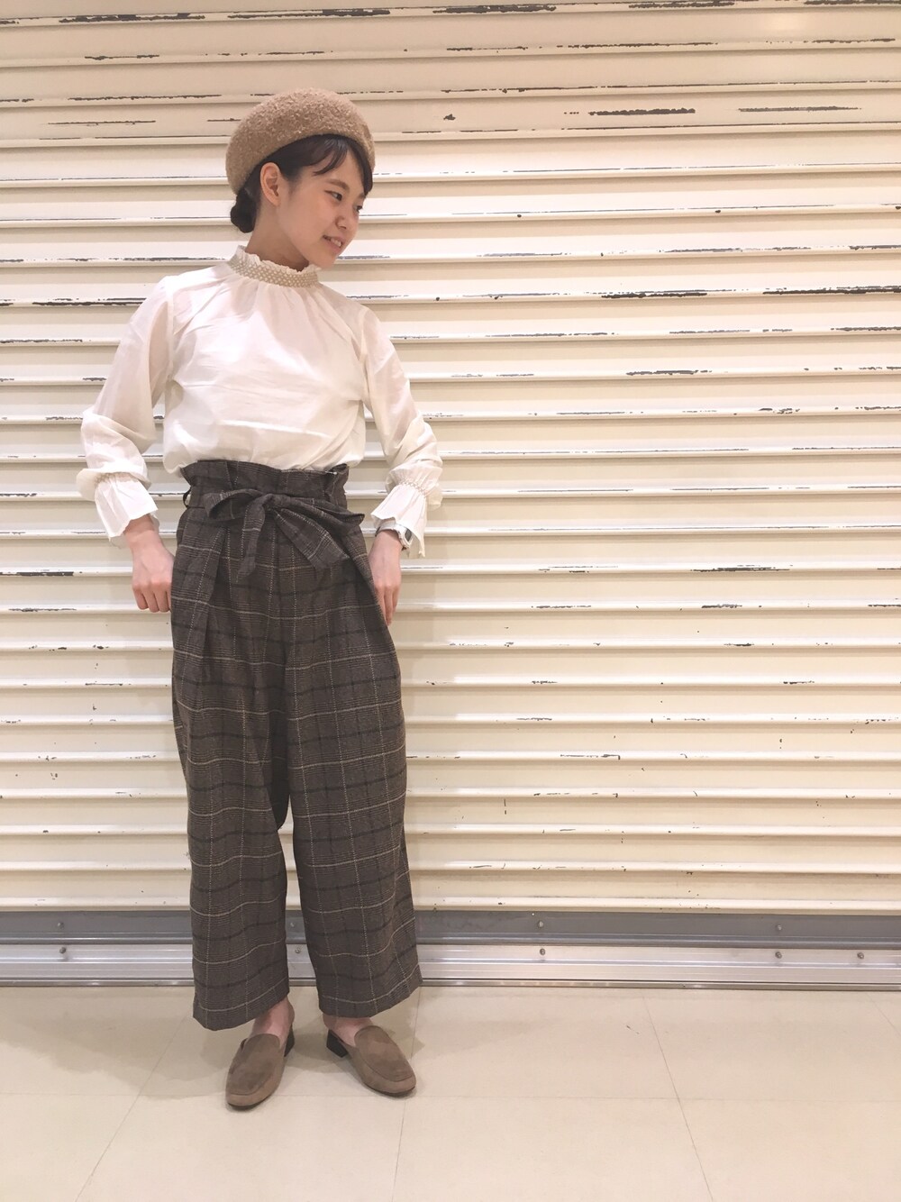 ベージュ × ブラウン で ちょっと、個性的なコーデ 🌿 チェックパンツを取り入れると 一気に 秋らしくなりますね…🌹