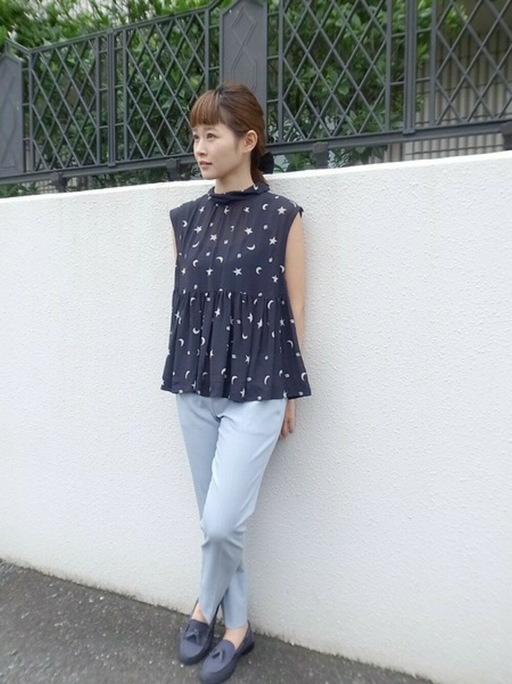 ORIGINAL PATTERN NO-SLEEVE DRESS に SLACKS を合わせました。 CANVAS TASSEL LOAFERもネイビーで、ブルーコーデです!