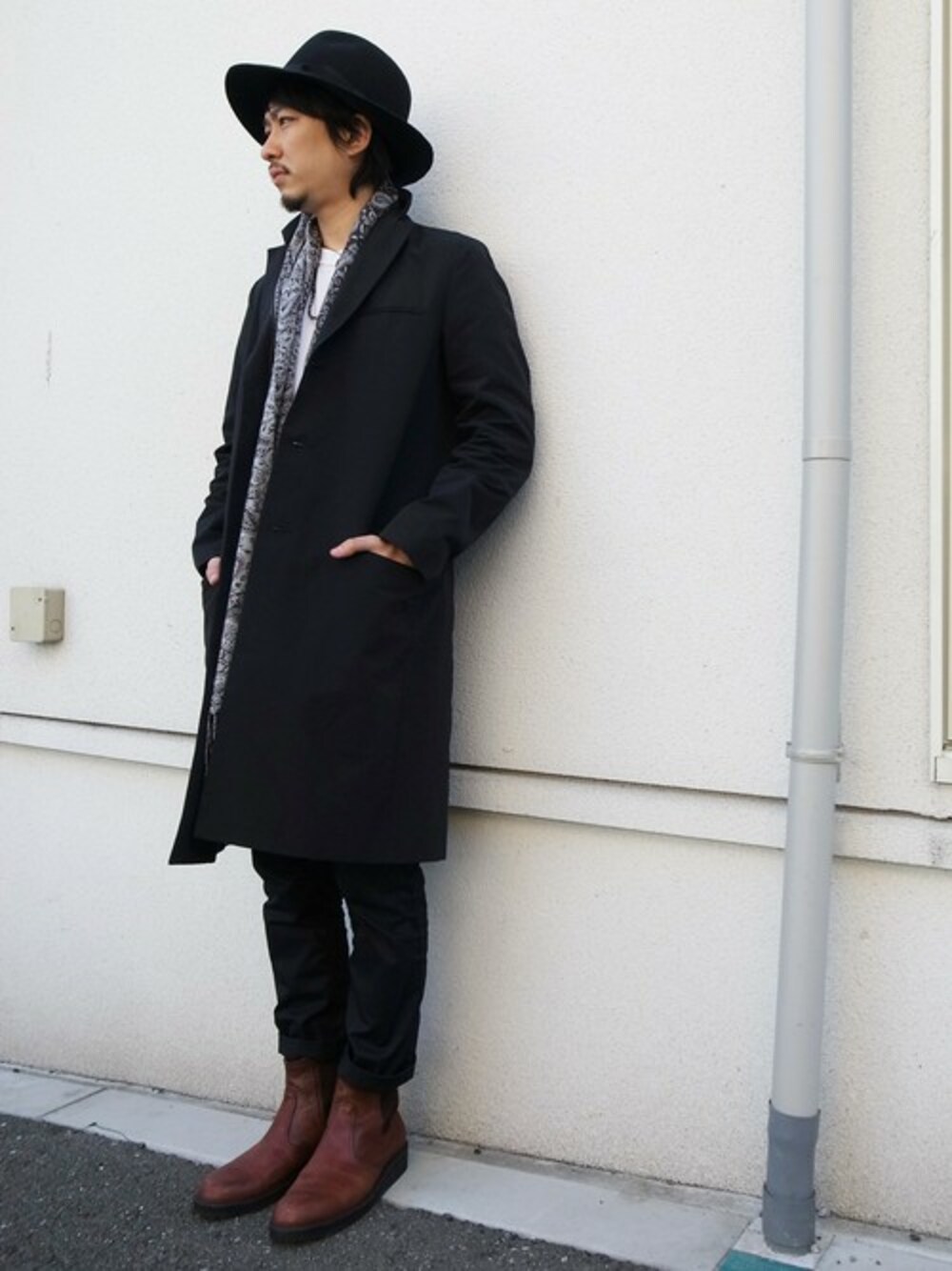 モノトーンなカラーリングとチェスターコートで大人な雰囲気を演出。 男女問わずトレンドのチェスターコートはマストです! ペイズリー柄のストールをアクセントに。