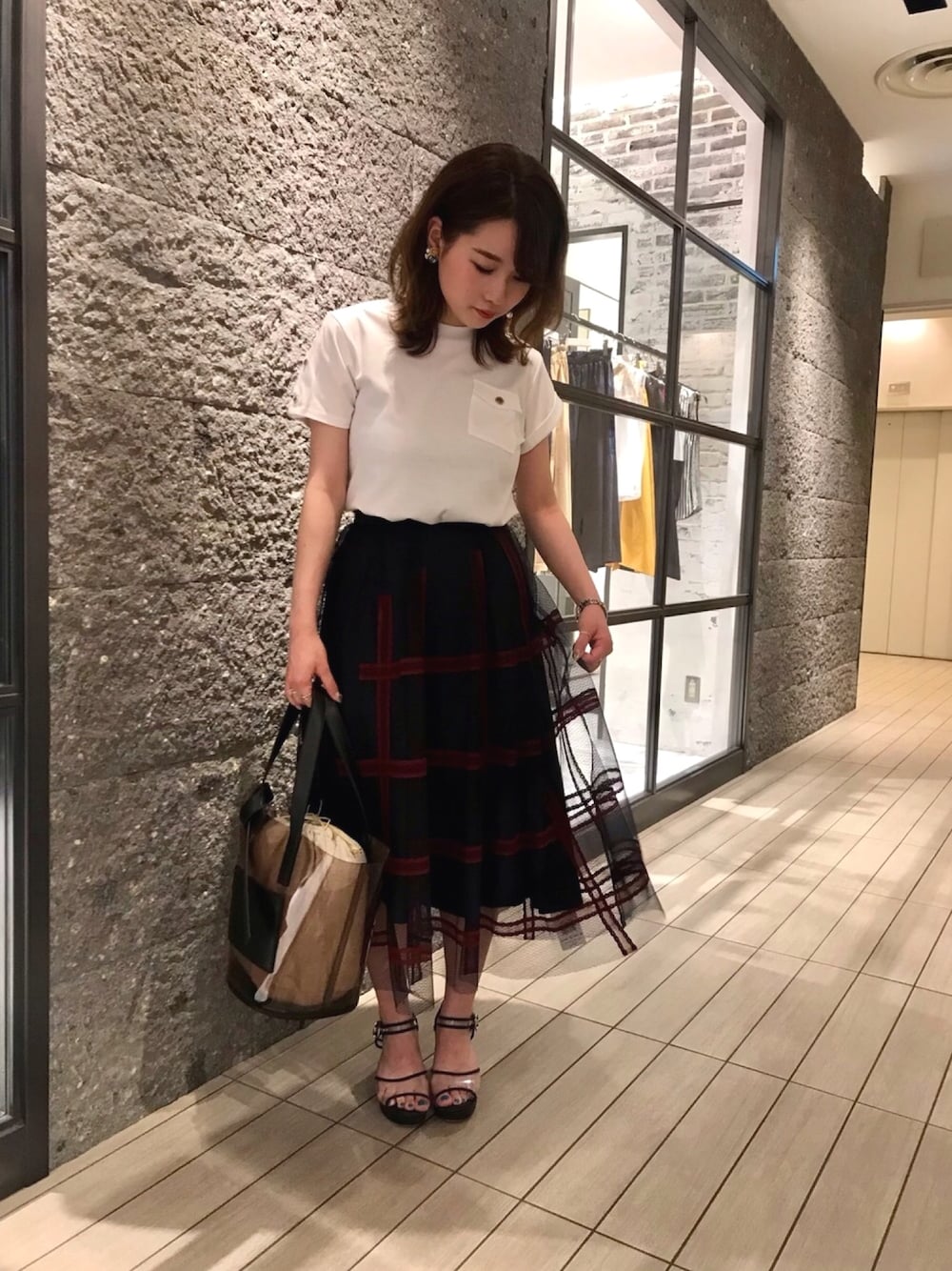 涼しげなチュール素材に繊細なレースでチェック柄を遇らった上品なスカート。 休日はTシャツと合わせてドレスダウン♪