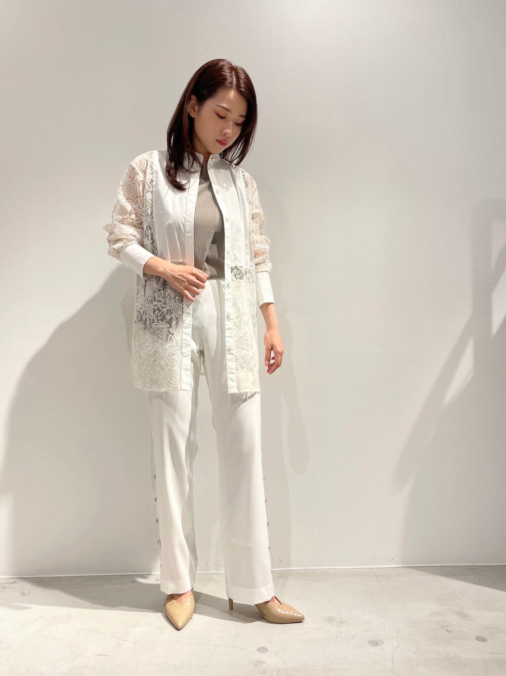 白地にゴールドで施された華やかなレースのブラウスを軽く羽織ったコーデ。全体をトーナルカラーでまとめることでレースのシャツがより引き立ちます◎