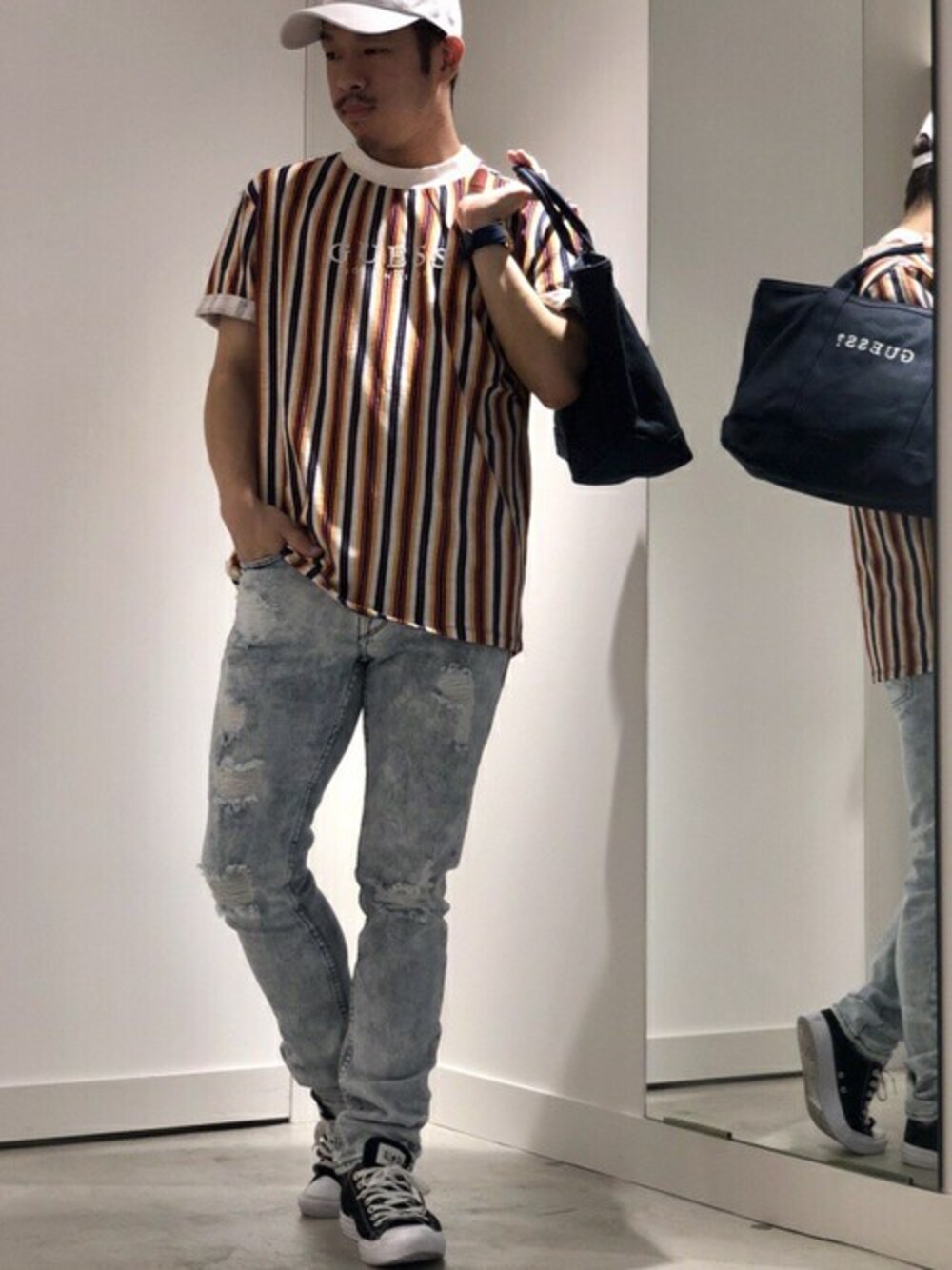 GUESS JAPAN(GUESS JAPAN)のキャップ「Triangle Logo 6Panel Cap (ゲス トライアングルロゴ 6パネルキャップ)」を使ったコーディネート
