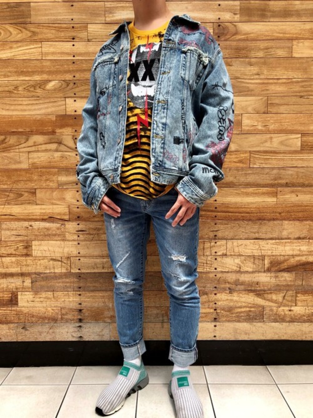 GUESS JAPAN(GUESS JAPAN)のデニムジャケット「Dillon Graffiti Denim Jacket」を使ったコーディネート