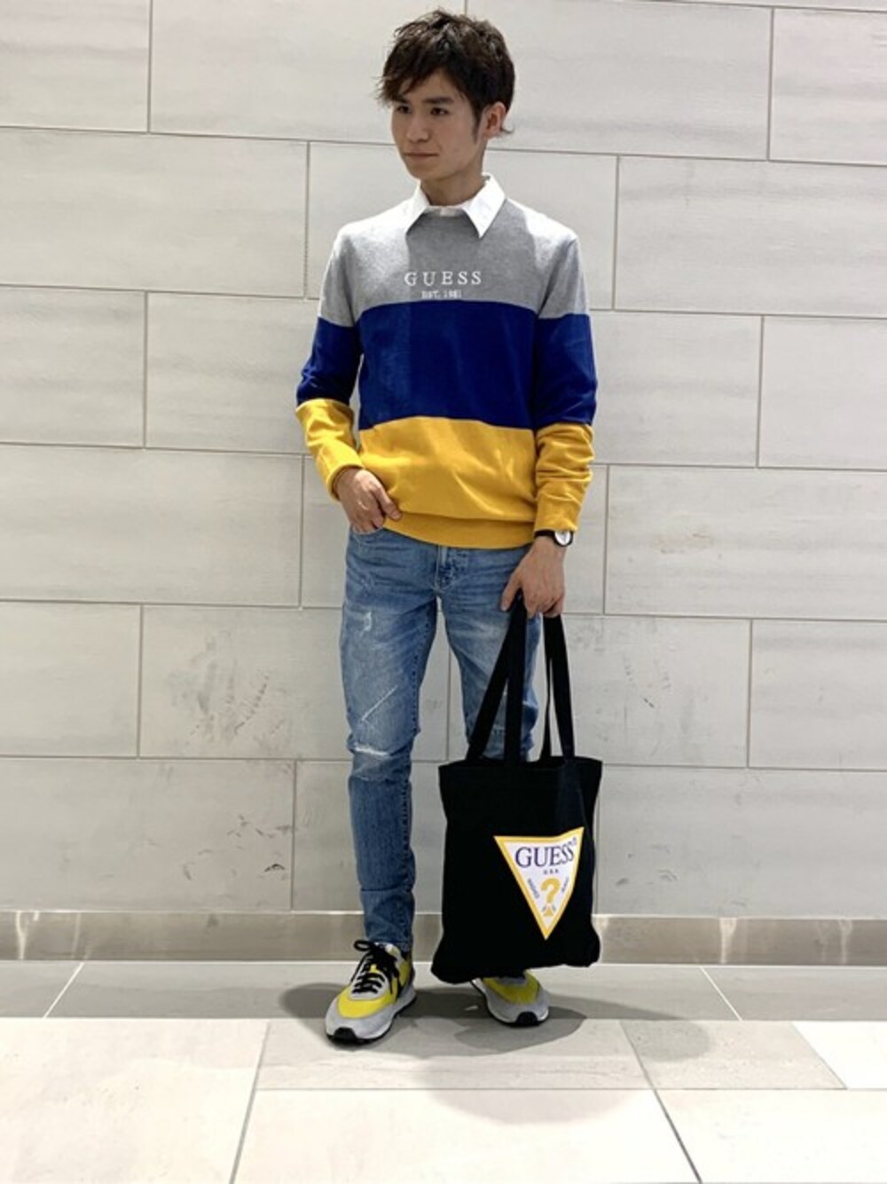 GUESS JAPAN(GUESS JAPAN)のスウェット「COLOUR-BLOCK PRINT LOGO SWEATER」を使ったコーディネート