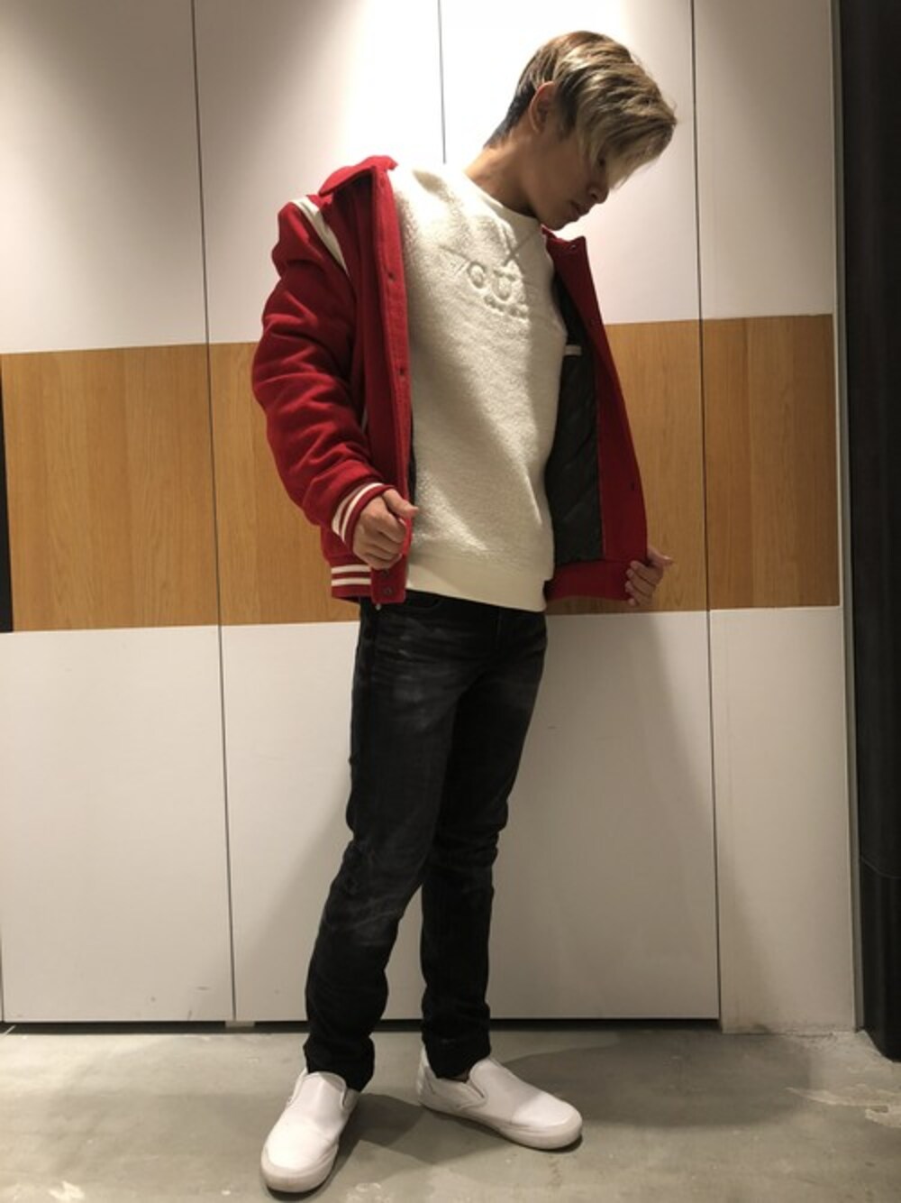 GUESS JAPAN(GUESS JAPAN)のスタジャン「COLLEGE LOGO VARSITY BOMBER JACKET」を使ったコーディネート