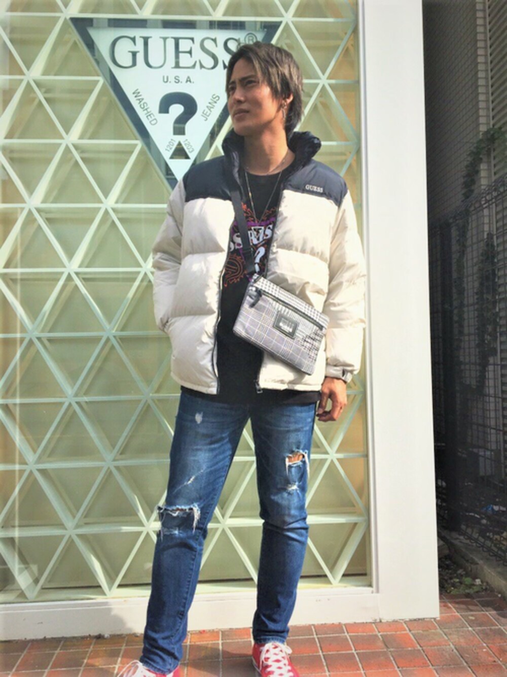 GUESS JAPAN(GUESS JAPAN)のダウンジャケット/コート「TRIANGLE LOGO DOWN JACKET」を使ったコーディネート