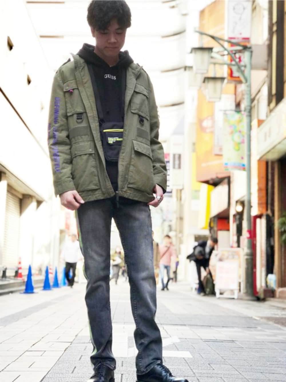 GUESS JAPAN(GUESS JAPAN)のデニムパンツ「Reflective Logo-Tape Slim Tapered Denim Pant」を使ったコーディネート