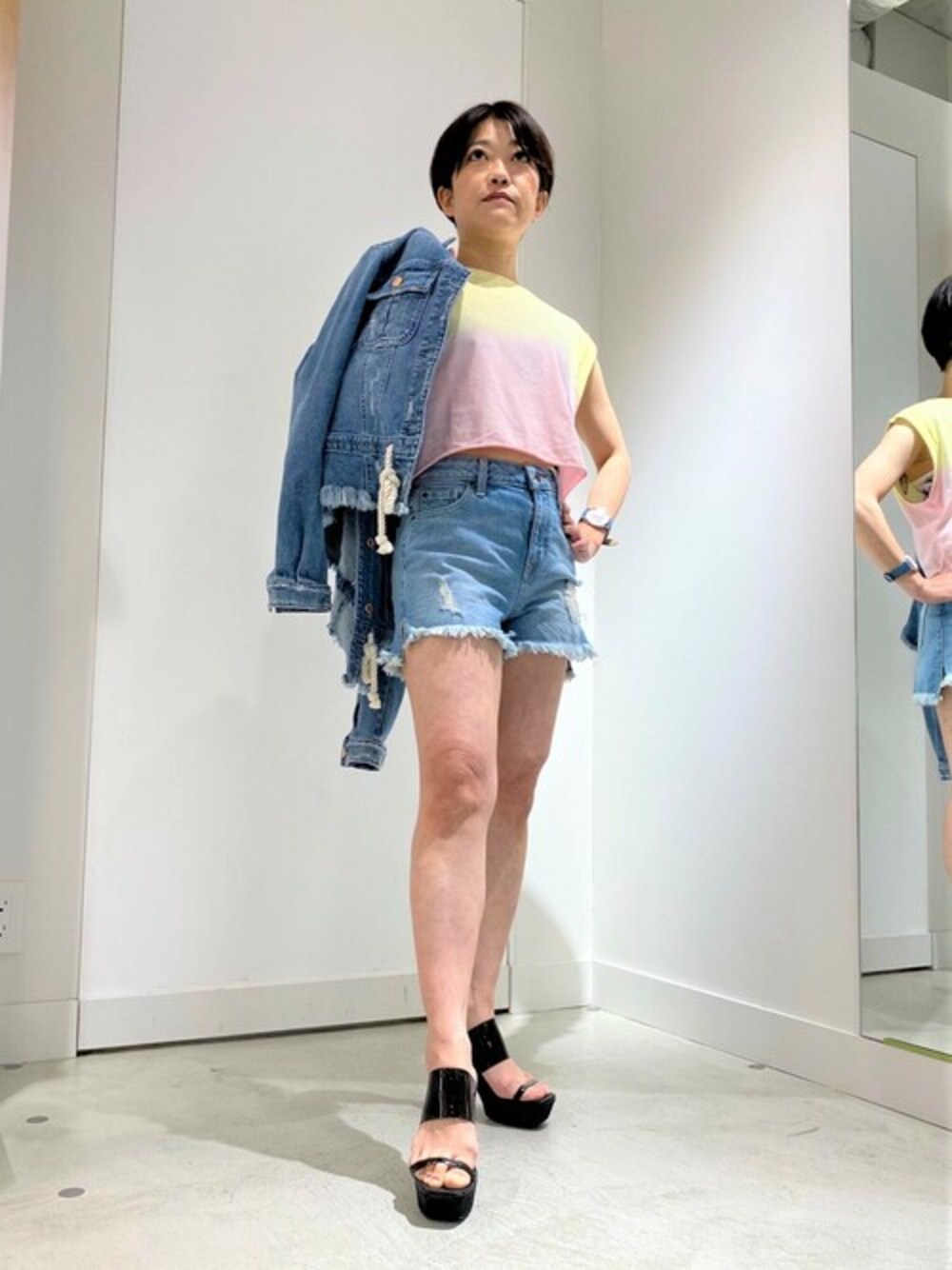 GUESS JAPAN(GUESS JAPAN)のTシャツ/カットソー「Sleeveless Sunrise Embroidery Cropped Tee」を使ったコーディネート