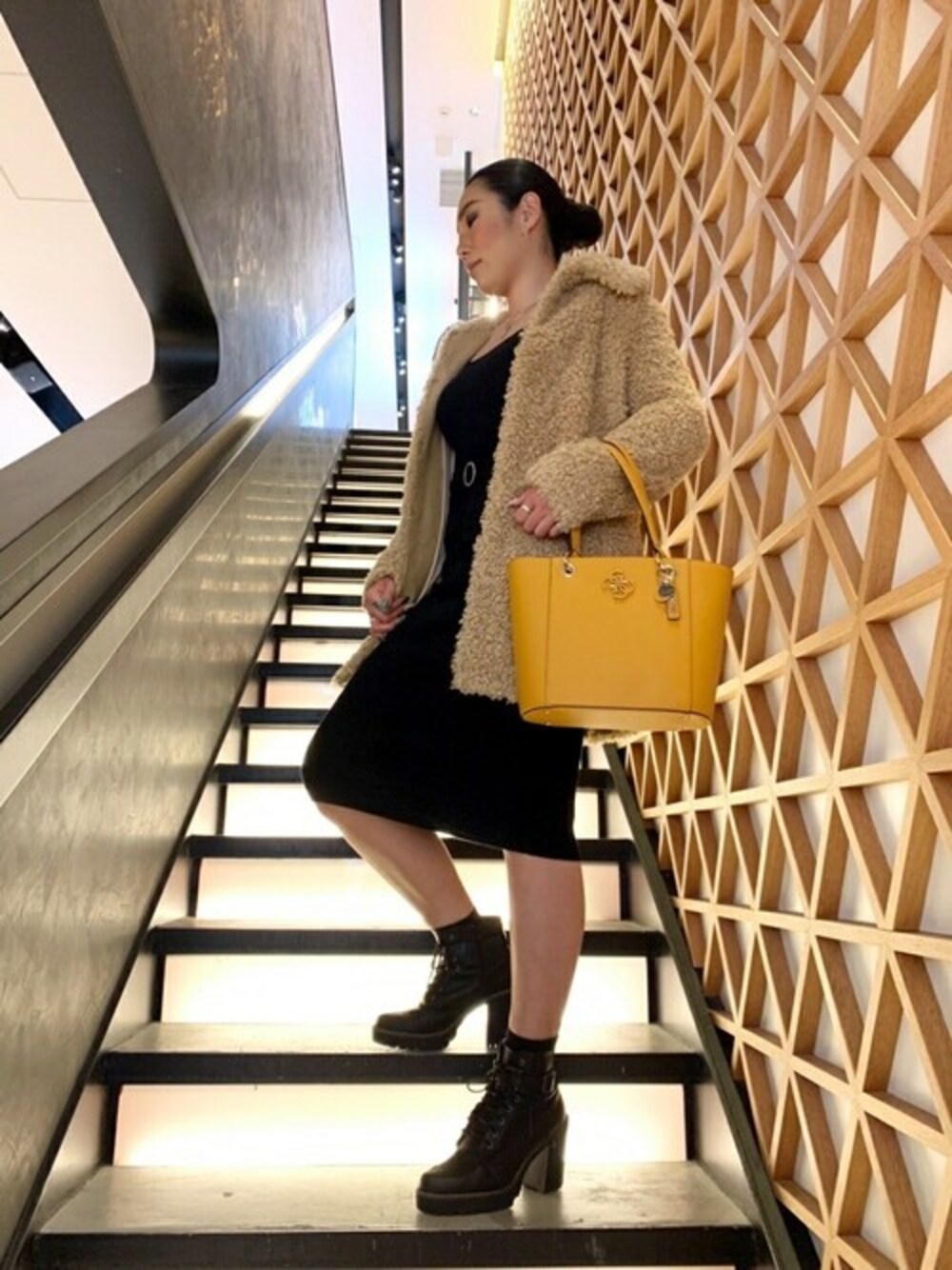 デートにオススメのニットドレスはウェスト部分にベルト付きでスタイルUPに♪ モコモコアウターは女性らしく見せてくれます!!