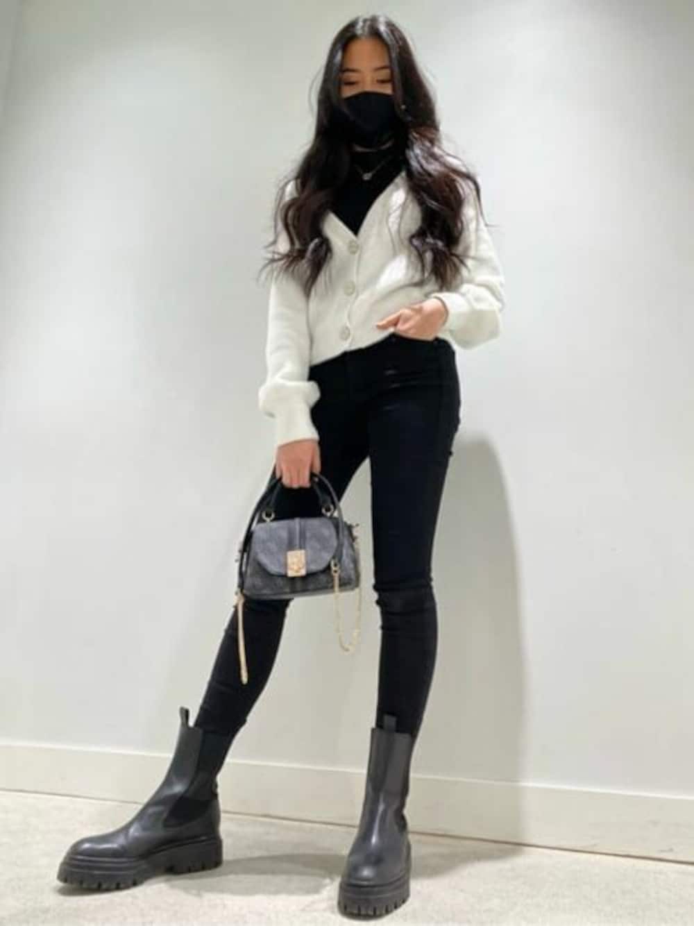 大人可愛いモノトーンコーデです! インナーで使用しているトップスはアメリカンスリーブになっているので、実際は少しだけ肌が見えるのがポイント! 黒のデニムパンツは綿97%、ポリウレタン3%なので、ストレッチが効いている上に肌触りが優しいです シンプルなコーデにクワトロGのバッグを合わせてワンポイント!
