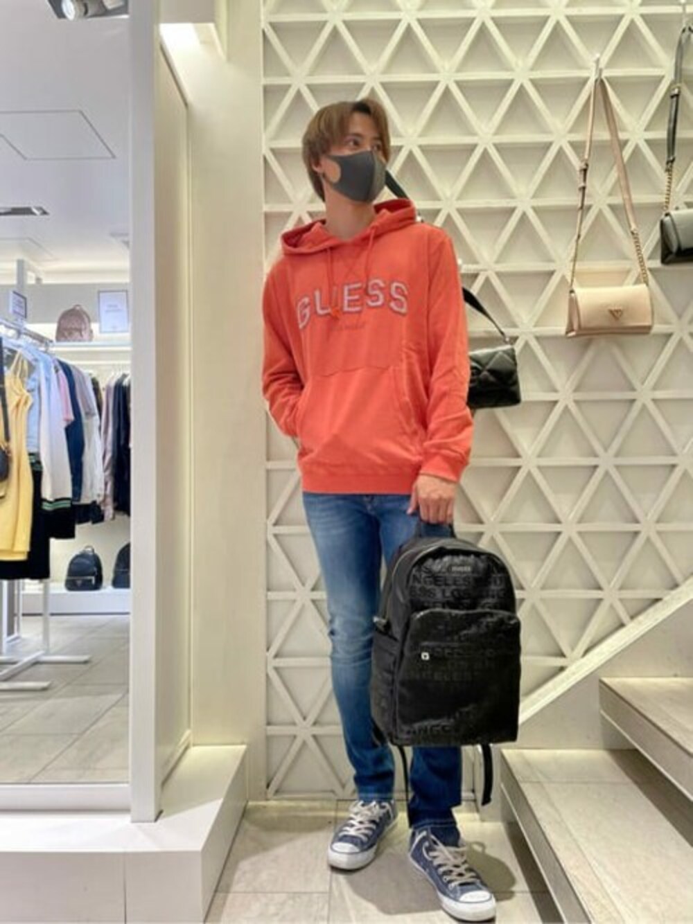古着感のあるレトロなパーカー!!サイズ感も大きめでゆったり着れるのでオーバーサイズが好きな方にはオススメ!! 裏起毛になっているので冬でも暖かくて使い勝手もいいと思います!! デニムはスキニータイプになっており、ストレッチも効いているので履き心地も良いのがポイントです!!色味もブルーデニムでダメージの加工もないのでオールシーズン履いて頂けるデニムになります!! リュックはエナメルロゴの総柄になっているので遠目からだとシンプルに見えますが、近くだとロゴの主張があるのでGUESSらしさもあってオススメです!サイズ感もパソコンやA4サイズも入るので使いやすさもあります!!