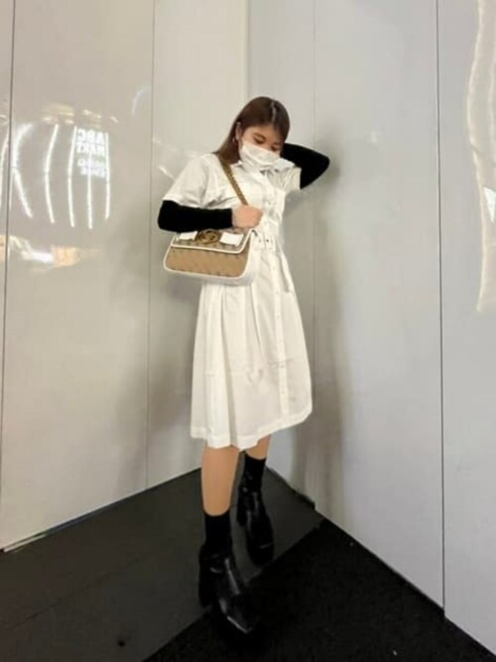 白いシャツワンピースは丈が短くないので、脚の露出に抵抗がある方にもおすすめ!! 半袖なのでインナーに黒のタイトめなニットトップスを合わせると春でも着られます◎