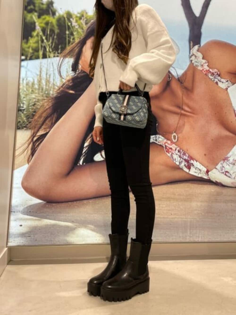 白×黒のモノトーンコーデです! バッグはクワトロGのデニム生地バッグでシンプルすぎないようにしました!! 【着用サイズ】 トップス XS ボトムス 23