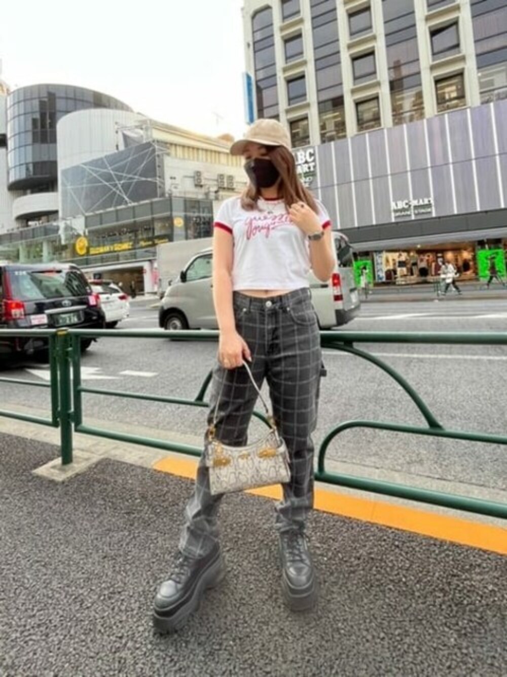 メンズのCLOTTEEコラボ、カーペンターデニムにレディースのクロップTを合わせてメンズライクなコーディネートに♡ キャップも後ろのベルト部分が可愛くておすすめ! パイソンのBAGは流行りの形で店舗でも大人気の商品です◎