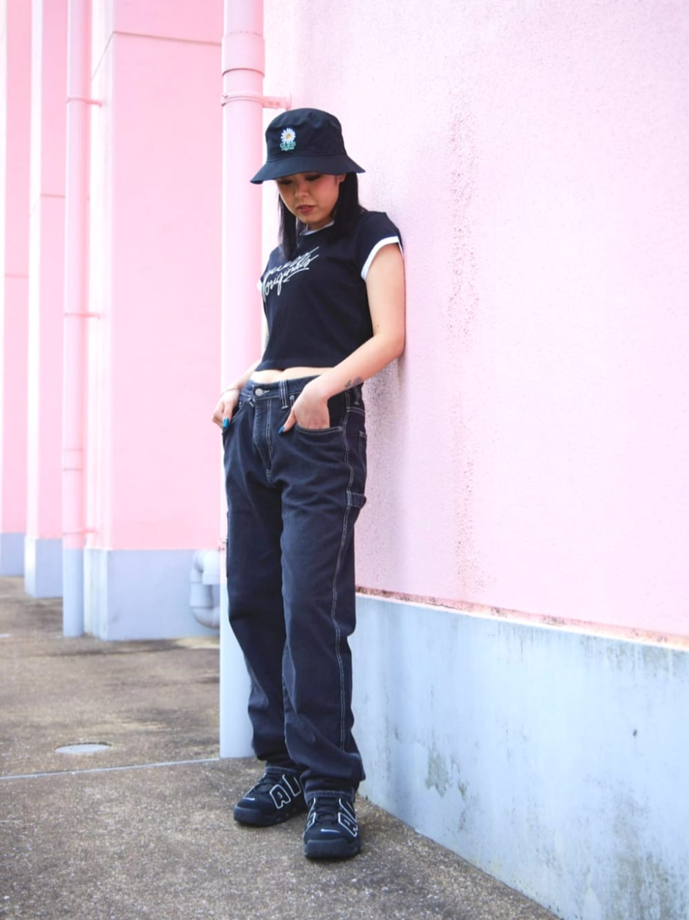 クロップド丈のトップスにメンズデニムを合わせ ストリート女子コーディネート!! 夏だけど黒!っていうのと カジュアルですが、女の子らしさを出すために 程よいヘソ出しがポイントです! 是非真似してみてください!